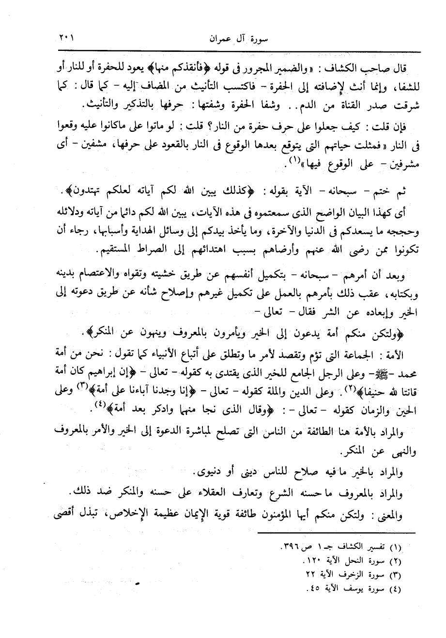وبعد أن أمرهم- سبحانه- بتكميل أنفسهم عن طريق خشيته وتقواه والاعتصام بدينه وبكتابه، عقب ذلك بأمرهم بالعمل على تكميل غيرهم وإصلاح شأنه عن طريق دعوته إلى الخير وإبعاده عن الشر فقال- تعالى- وَلْتَكُنْ مِنْكُمْ أُمَّةٌ يَدْعُونَ إِلَى الْخَيْرِ وَيَأْمُرُونَ بِالْمَعْرُوفِ وَيَنْهَوْنَ عَنِ الْمُنْكَرِ.