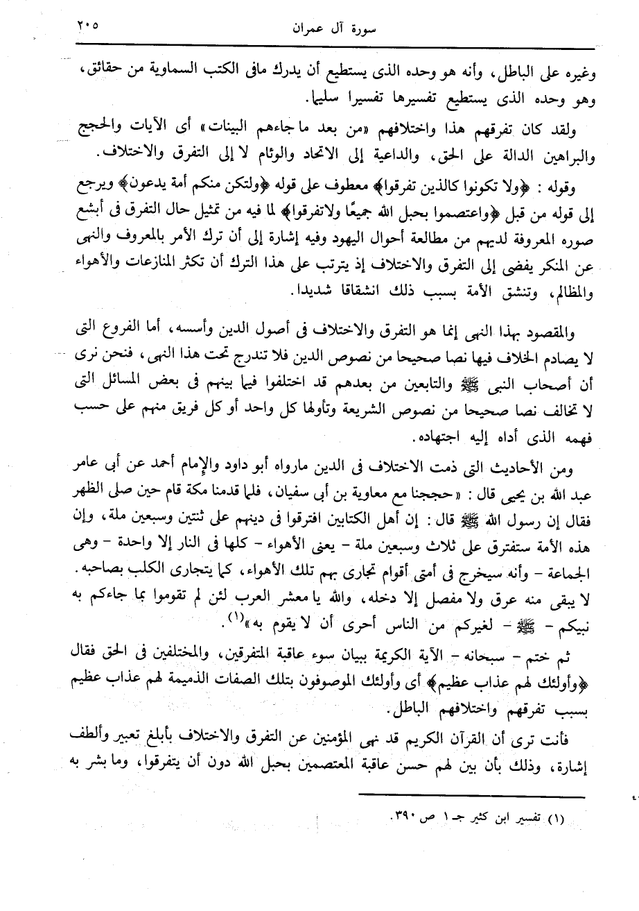 وقوله: وَلا تَكُونُوا كَالَّذِينَ تَفَرَّقُوا معطوف على قوله وَلْتَكُنْ مِنْكُمْ أُمَّةٌ يَدْعُونَ ويرجع إلى قوله من قبل وَاعْتَصِمُوا بِحَبْلِ اللَّهِ جَمِيعاً وَلا تَفَرَّقُوا لما فيه من تمثيل حال التفرق في أبشع صوره المعروفة لديهم من مطالعة أحوال اليهود وفيه إشارة إلى أن ترك الأمر بالمعروف والنهى عن المنكر يفضى إلى التفرق والاختلاف إذ يترتب على هذا الترك أن تكثر المنازعات والأهواء والمظالم، وتنشق الأمة بسبب ذلك انشقاقا شديدا.