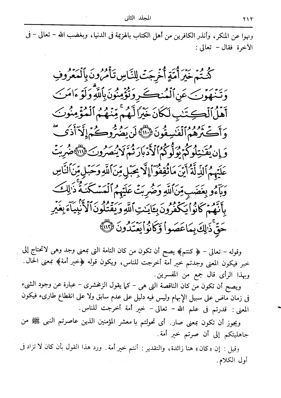 كُنْتُمْ خَيْرَ أُمَّةٍ أُخْرِجَتْ لِلنَّاسِ تَأْمُرُونَ بِالْمَعْرُوفِ وَتَنْهَوْنَ عَنِ الْمُنْكَرِ وَتُؤْمِنُونَ بِاللَّهِ وَلَوْ آمَنَ أَهْلُ الْكِتابِ لَكانَ خَيْراً لَهُمْ مِنْهُمُ الْمُؤْمِنُونَ وَأَكْثَرُهُمُ الْفاسِقُونَ (110) لَنْ يَضُرُّوكُمْ إِلاَّ أَذىً وَإِنْ يُقاتِلُوكُمْ يُوَلُّوكُمُ الْأَدْبارَ ثُمَّ لا يُنْصَرُونَ (111) ضُرِبَتْ عَلَيْهِمُ الذِّلَّةُ أَيْنَ ما ثُقِفُوا إِلاَّ بِحَبْلٍ مِنَ اللَّهِ وَحَبْلٍ مِنَ النَّاسِ وَباؤُ بِغَضَبٍ مِنَ اللَّهِ وَضُرِبَتْ عَلَيْهِمُ الْمَسْكَنَةُ ذلِكَ بِأَنَّهُمْ كانُوا يَكْفُرُونَ بِآياتِ اللَّهِ وَيَقْتُلُونَ الْأَنْبِياءَ بِغَيْرِ حَقٍّ ذلِكَ بِما عَصَوْا وَكانُوا يَعْتَدُونَ (112)