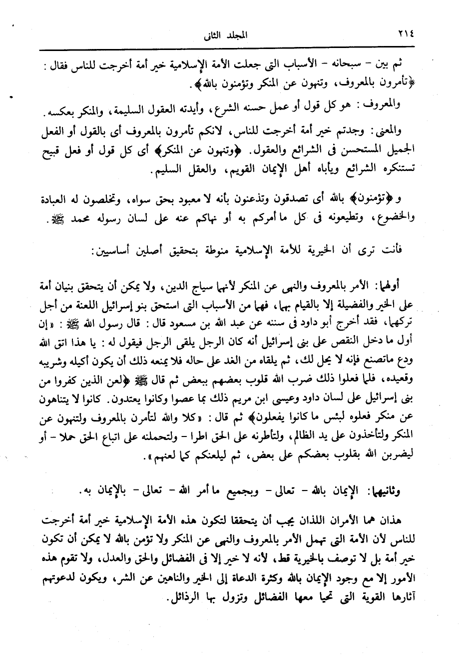 هذان هما الأمران اللذان يجب أن يتحققا لتكون هذه الأمة الإسلامية خير أمة أخرجت للناس لأن الأمة التي تهمل الأمر بالمعروف والنهى عن المنكر ولا تؤمن بالله لا يمكن أن تكون خير أمة بل لا توصف بالخيرية قط، لأنه لا خير إلا في الفضائل والحق والعدل، ولا تقوم هذه الأمور إلا مع وجود الإيمان بالله وكثرة الدعاة إلى الخير والناهين عن الشر، ويكون لدعوتهم آثارها القوية التي تحيا معها الفضائل وتزول بها الرذائل.