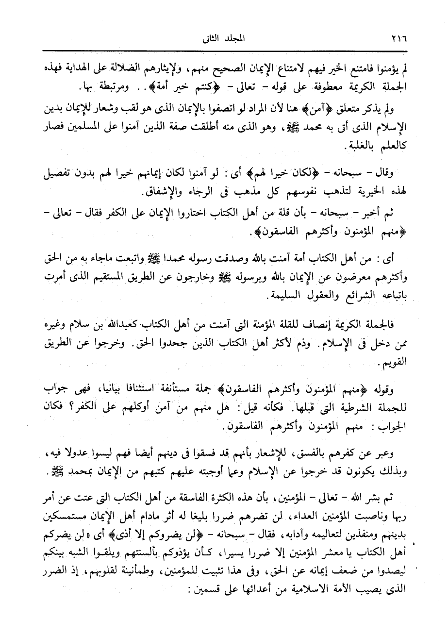 لم يؤمنوا فامتنع الخير فيهم لامتناع الإيمان الصحيح منهم، ولإيثارهم الضلالة على الهداية فهذه الجملة الكريمة معطوفة على قوله- تعالى- كُنْتُمْ خَيْرَ أُمَّةٍ.. ومرتبطة بها.