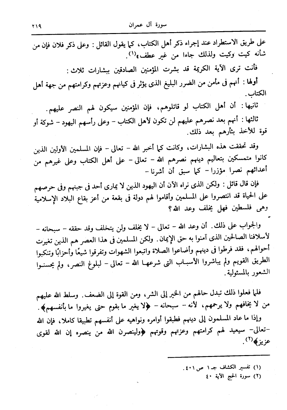 وإذا ما عاد المسلمون إلى دينهم فطبقوا أوامره ونواهيه على أنفسهم تطبيقا كاملا، فإن الله- تعالى- سيعيد لهم كرامتهم وعزتهم وقوتهم وَلَيَنْصُرَنَّ اللَّهُ مَنْ يَنْصُرُهُ إِنَّ اللَّهَ لَقَوِيٌّ عَزِيزٌ «2» .