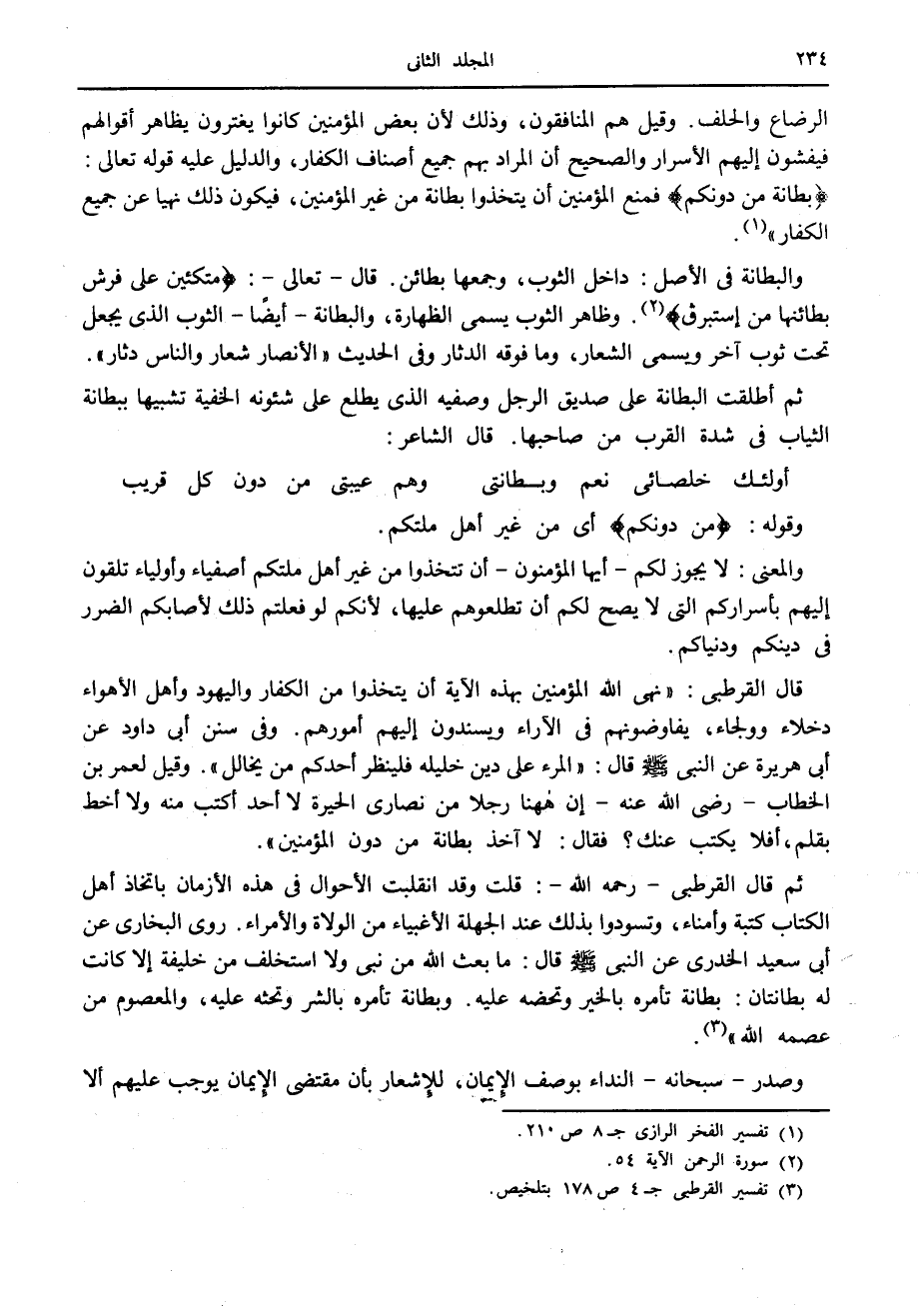 قال القرطبي: «نهى الله المؤمنين بهذه الآية أن يتخذوا من الكفار واليهود وأهل الأهواء دخلاء وولجاء، يفاوضونهم في الآراء ويسندون إليهم أمورهم. وفي سنن أبى داود عن أبى هريرة عن النبي صلّى الله عليه وسلّم قال: «المرء على دين خليله فلينظر أحدكم من يخالل» . وقيل لعمر بن الخطاب- رضى الله عنه- إن هاهنا رجلا من نصارى الحيرة لا أحد أكتب منه ولا أخط بقلم، أفلا يكتب عنك؟ فقال: لا آخذ بطانة من دون المؤمنين» .