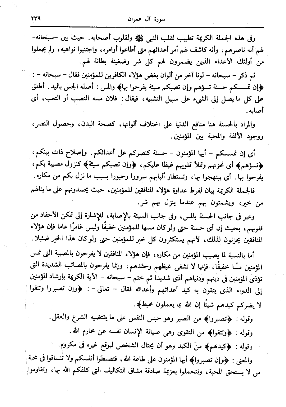 أما بالنسبة لما يصيب المؤمنين من مكاره، فإن هؤلاء المنافقين لا يفرحون بالمصيبة التي تمس المؤمنين مسا خفيفا، فإنها لا تشفى غيظهم وحقدهم، وإنما يفرحون بالمصائب الشديدة التي تؤذى المؤمنين في دينهم ودنياهم أذى شديدا ثم ختم- سبحانه- الآية الكريمة بإرشاد المؤمنين إلى الدواء الذي يتقون به كيد أعدائهم وأعدائه فقال- تعالى-: وَإِنْ تَصْبِرُوا وَتَتَّقُوا لا يَضُرُّكُمْ كَيْدُهُمْ شَيْئاً إِنَّ اللَّهَ بِما يَعْمَلُونَ مُحِيطٌ.