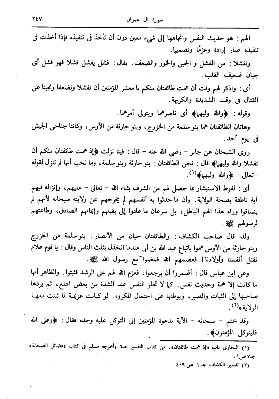 ولذا قال صاحب الكشاف: والطائفتان حيان من الأنصار: بنو سلمة من الخزرج وبنو حارثة من الأوس هموا باتباع عبد الله بن أبى عند ما انخذل بثلث الناس وقال: يا قوم علام نقتل أنفسنا وأولادنا! فعصمهم الله فمضوا مع رسول الله صلّى الله عليه وسلّم.