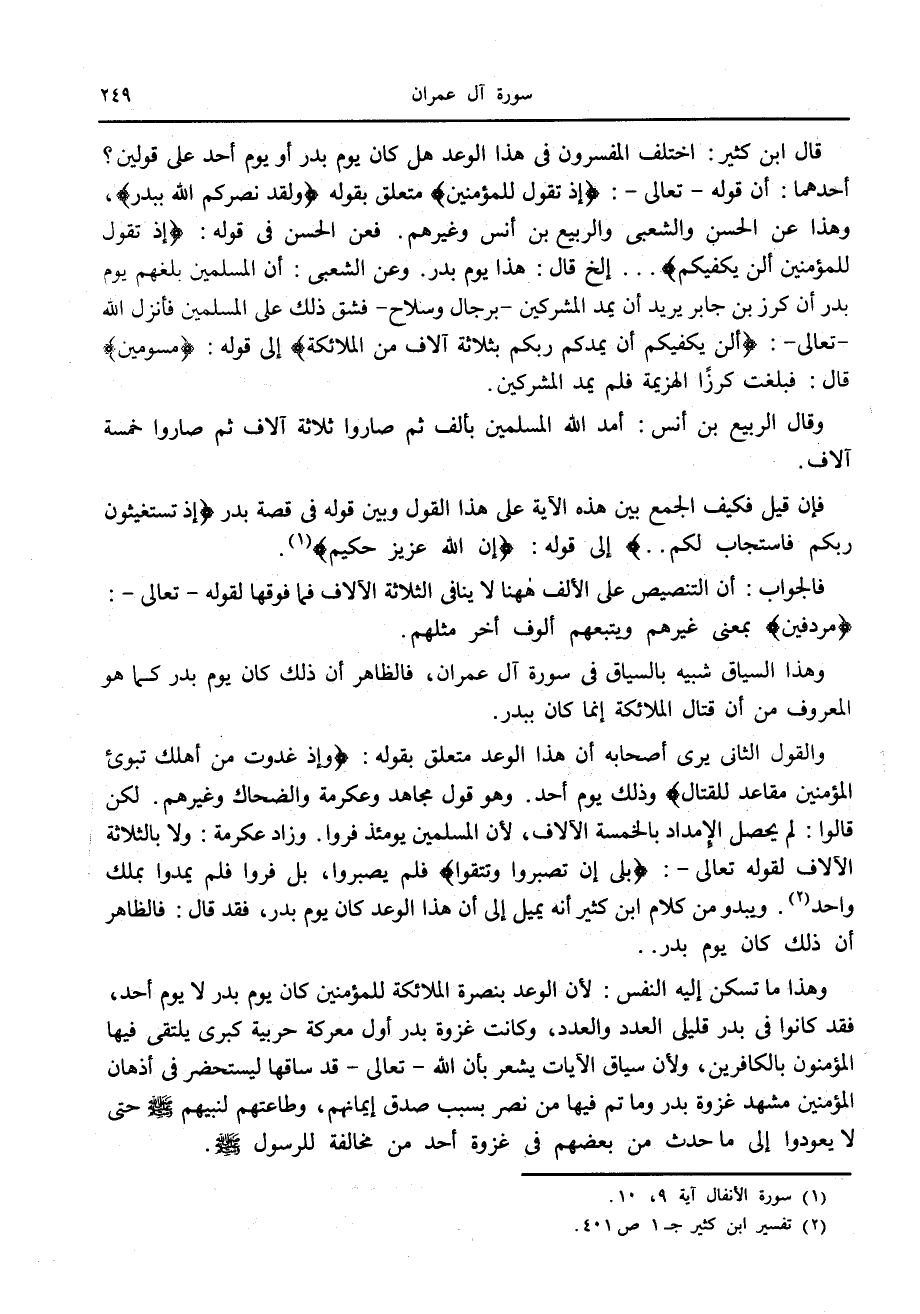 وهذا ما تسكن إليه النفس: لأن الوعد بنصرة الملائكة للمؤمنين كان يوم بدر لا يوم أحد، فقد كانوا في بدر قليلي العدد والعدد، وكانت غزوة بدر أول معركة حربية كبرى يلتقى فيها المؤمنون بالكافرين، ولأن سياق الآيات يشعر بأن الله- تعالى- قد ساقها ليستحضر في أذهان المؤمنين مشهد غزوة بدر وما تم فيها من نصر بسبب صدق إيمانهم، وطاعتهم لنبيهم صلّى الله عليه وسلّم حتى لا يعودوا إلى ما حدث من بعضهم في غزوة أحد من مخالفة للرسول صلّى الله عليه وسلّم.