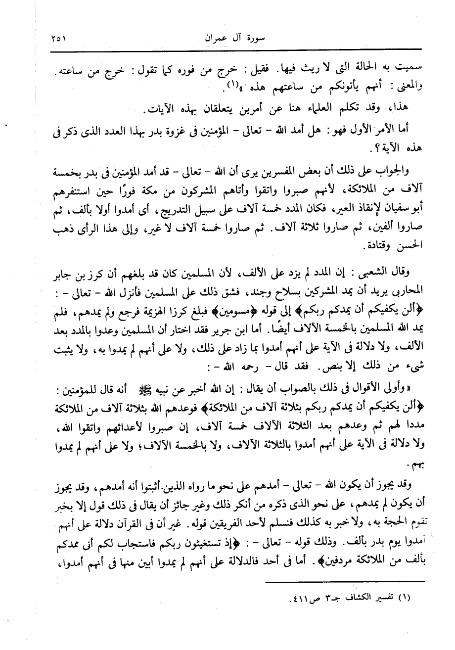 وقد يجوز أن يكون الله- تعالى- أمدهم على نحو ما رواه الذين أثبتوا أنه أمدهم، وقد يجوز أن يكون لم يمدهم، على نحو الذي ذكره من أنكر ذلك وغير جائز أن يقال في ذلك قول إلا بخبر تقوم الحجة به، ولا خبر به كذلك فنسلم لأحد الفريقين قوله. غير أن في القرآن دلالة على أنهم أمدوا يوم بدر بألف. وذلك قوله- تعالى-: إِذْ تَسْتَغِيثُونَ رَبَّكُمْ فَاسْتَجابَ لَكُمْ أَنِّي مُمِدُّكُمْ بِأَلْفٍ مِنَ الْمَلائِكَةِ مُرْدِفِينَ. أما في أحد فالدلالة على أنهم لم يمدوا أبين منها في أنهم أمدوا،