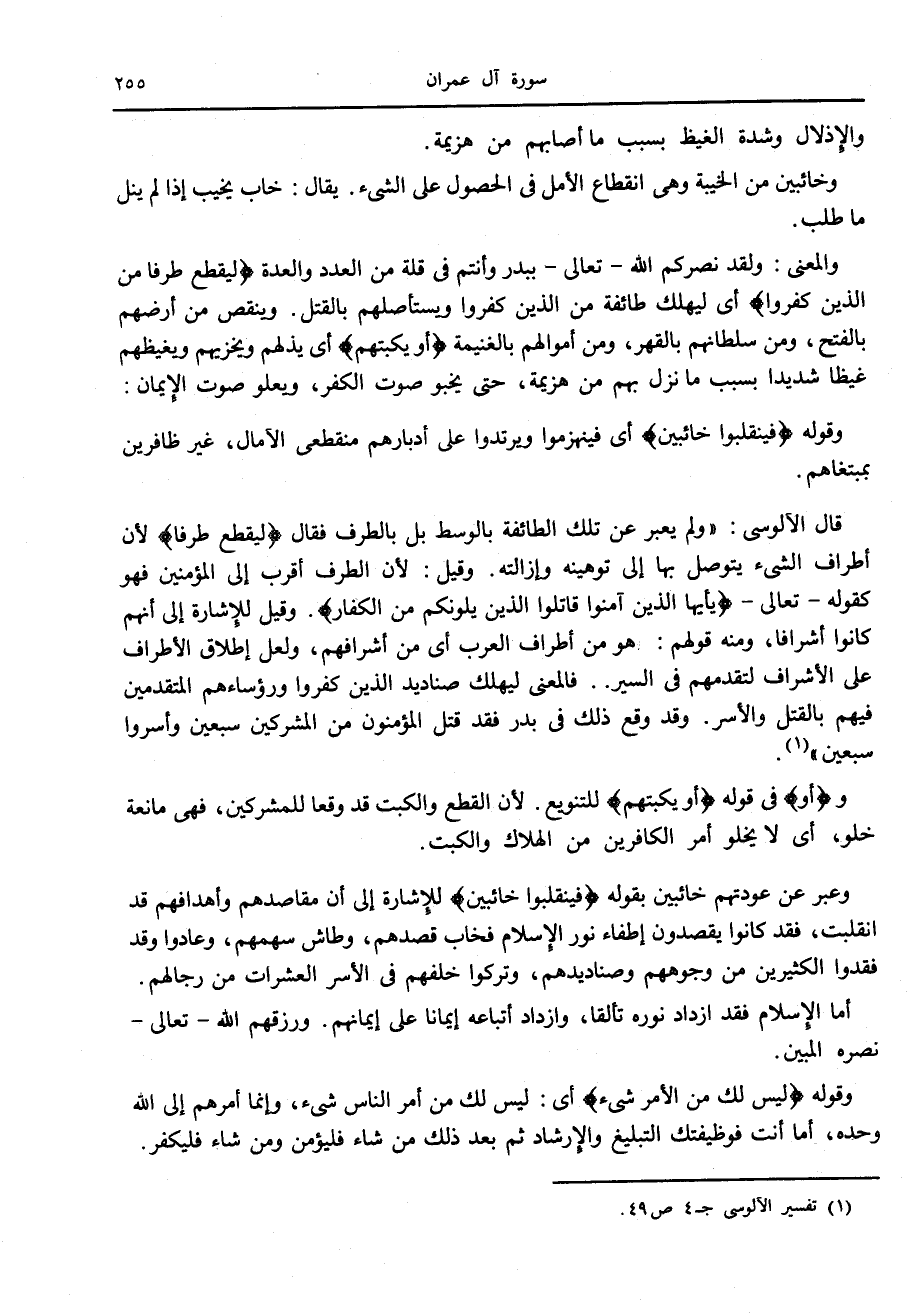 قال الآلوسى: «ولم يعبر عن تلك الطائفة بالوسط بل بالطرف فقال لِيَقْطَعَ طَرَفاً لأن أطراف الشيء يتوصل بها إلى توهينه وإزالته. وقيل: لأن الطرف أقرب إلى المؤمنين فهو كقوله- تعالى- يا أَيُّهَا الَّذِينَ آمَنُوا قاتِلُوا الَّذِينَ يَلُونَكُمْ مِنَ الْكُفَّارِ. وقيل للإشارة إلى أنهم كانوا أشرافا، ومنه قولهم: هو من أطراف العرب أى من أشرافهم، ولعل إطلاق الأطراف على الأشراف لتقدمهم في السير.. فالمعنى ليهلك صناديد الذين كفروا ورؤساءهم المتقدمين فيهم بالقتل والأسر. وقد وقع ذلك في بدر فقد قتل المؤمنون من المشركين سبعين وأسروا سبعين» «1» .