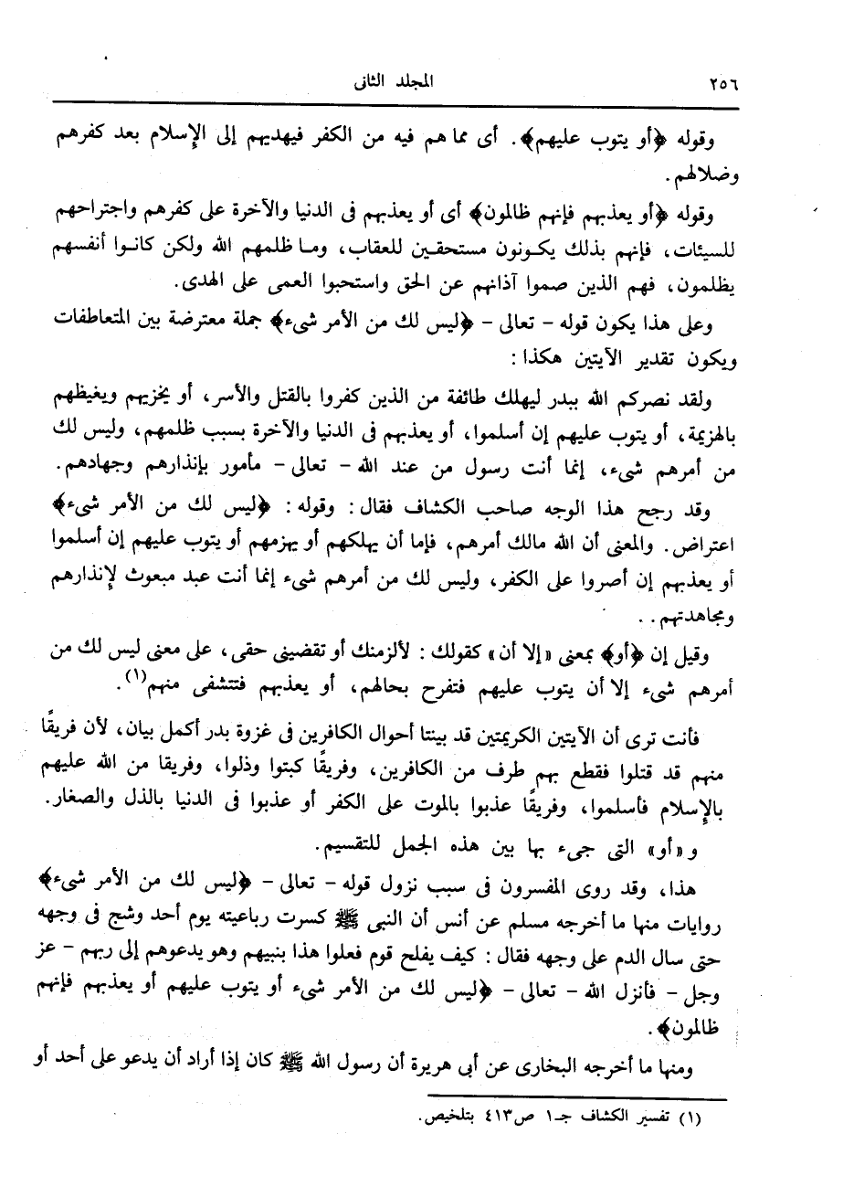 وقد رجح هذا الوجه صاحب الكشاف فقال: وقوله: لَيْسَ لَكَ مِنَ الْأَمْرِ شَيْءٌ اعتراض. والمعنى أن الله مالك أمرهم، فإما أن يهلكهم أو يهزمهم أو يتوب عليهم إن أسلموا أو يعذبهم إن أصروا على الكفر، وليس لك من أمرهم شيء إنما أنت عبد مبعوث لإنذارهم ومجاهدتهم..