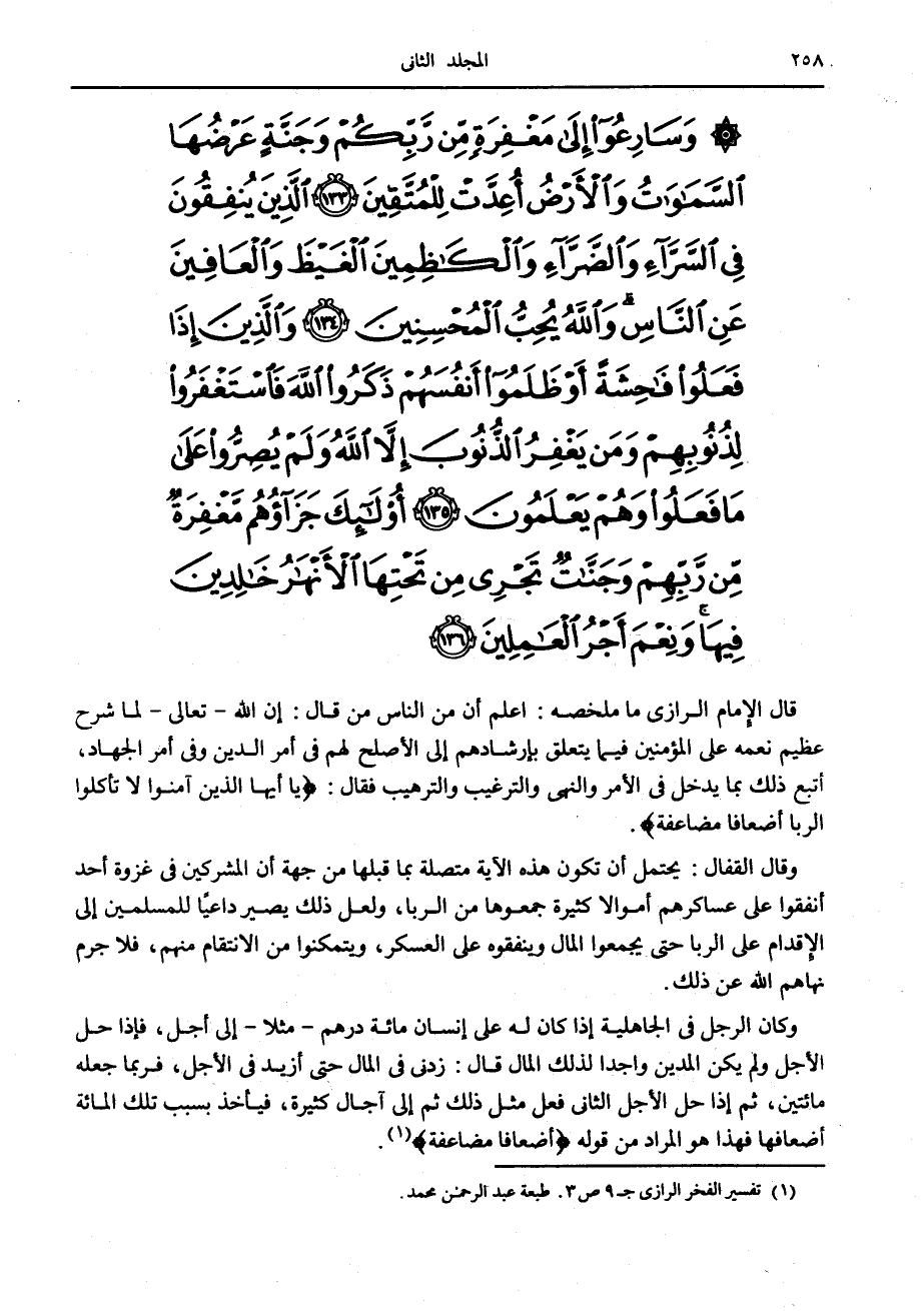 قال الإمام الرازي ما ملخصه: اعلم أن من الناس من قال: إن الله- تعالى- لما شرح عظيم نعمه على المؤمنين فيما يتعلق بإرشادهم إلى الأصلح لهم في أمر الدين وفي أمر الجهاد، أتبع ذلك بما يدخل في الأمر والنهى والترغيب والترهيب فقال: يا أَيُّهَا الَّذِينَ آمَنُوا لا تَأْكُلُوا الرِّبَوا أَضْعافاً مُضاعَفَةً.