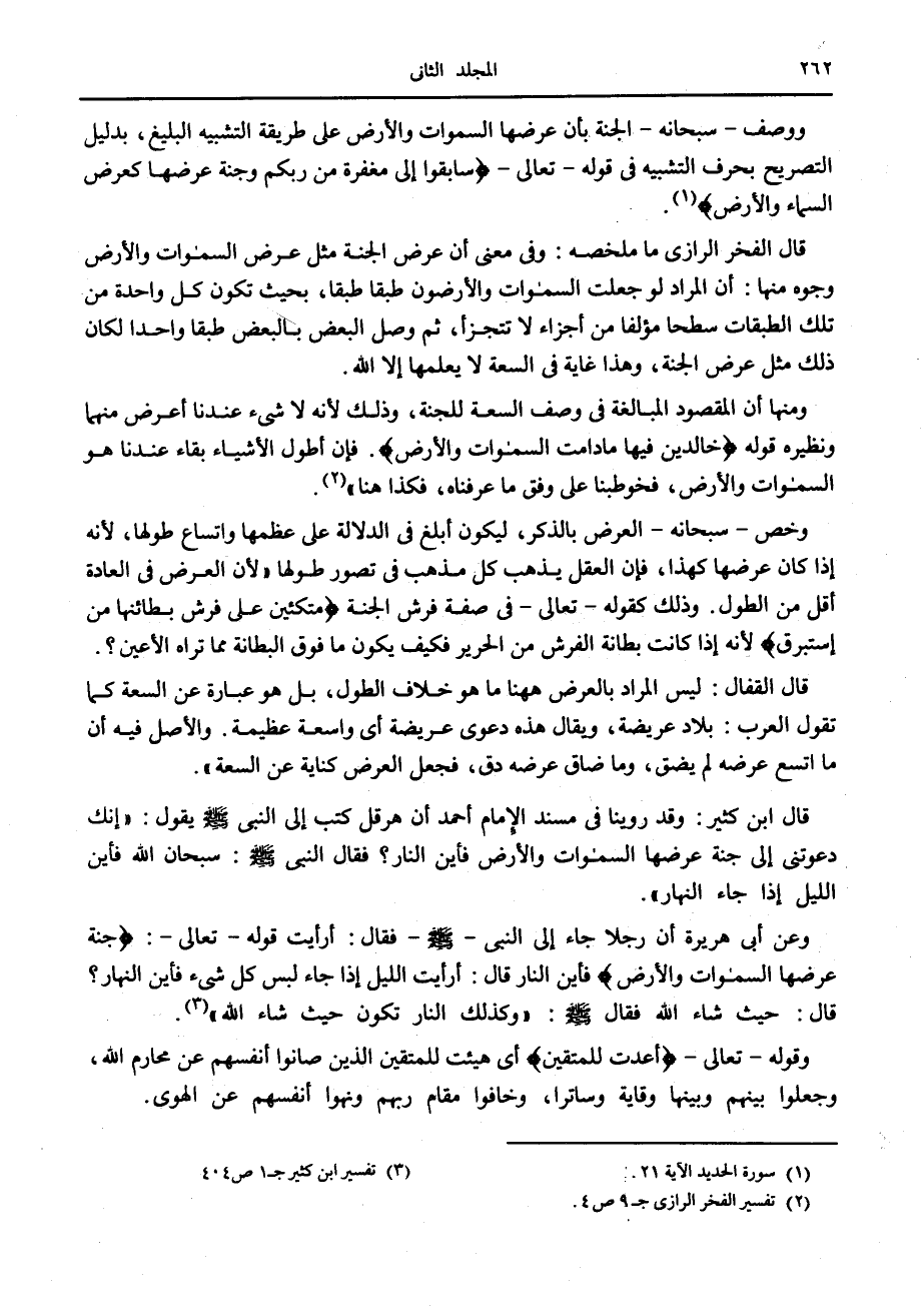 قال الفخر الرازي ما ملخصه: وفي معنى أن عرض الجنة مثل عرض السموات والأرض وجوه منها: أن المراد لو جعلت السموات والأرضون طبقا طبقا، بحيث تكون كل واحدة من تلك الطبقات سطحا مؤلفا من أجزاء لا تتجزأ، ثم وصل البعض بالبعض طبقا واحدا لكان ذلك مثل عرض الجنة، وهذا غاية في السعة لا يعلمها إلا الله.