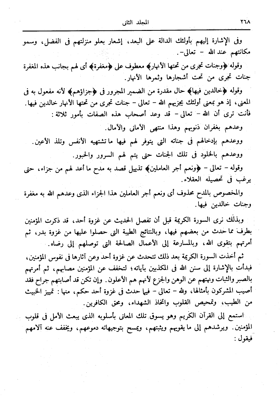 استمع إلى القرآن الكريم وهو يسوق تلك المعاني بأسلوبه الذي يبعث الأمل في قلوب المؤمنين. ويرشدهم إلى ما يقويهم ويثبتهم، ويمسح بتوجيهاته دموعهم، ويخفف عنه آلامهم فيقول: