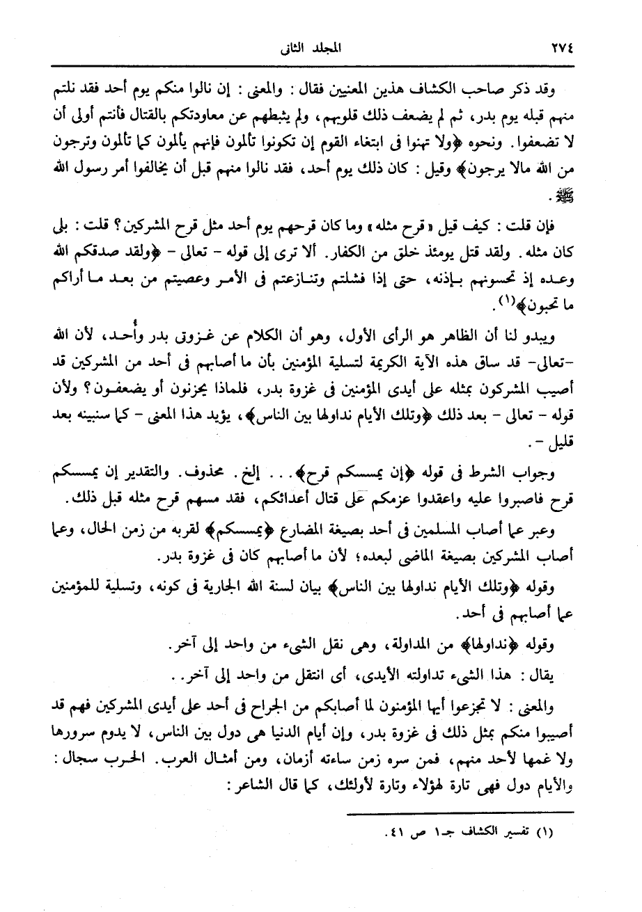 وقد ذكر صاحب الكشاف هذين المعنيين فقال: والمعنى: إن نالوا منكم يوم أحد فقد نلتم منهم قبله يوم بدر، ثم لم يضعف ذلك قلوبهم، ولم يثبطهم عن معاودتكم بالقتال فأنتم أولى أن لا تضعفوا. ونحوه وَلا تَهِنُوا فِي ابْتِغاءِ الْقَوْمِ إِنْ تَكُونُوا تَأْلَمُونَ فَإِنَّهُمْ يَأْلَمُونَ كَما تَأْلَمُونَ وَتَرْجُونَ مِنَ اللَّهِ ما لا يَرْجُونَ وقيل: كان ذلك يوم أحد، فقد نالوا منهم قبل أن يخالفوا أمر رسول الله صلّى الله عليه وسلّم.