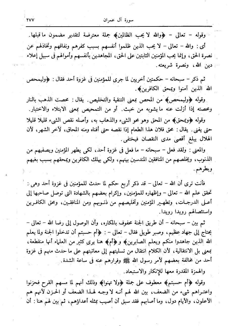 ثم ذكر- سبحانه- حكمتين أخريين لما جرى للمؤمنين في غزوة أحد فقال: وَلِيُمَحِّصَ اللَّهُ الَّذِينَ آمَنُوا وَيَمْحَقَ الْكافِرِينَ.