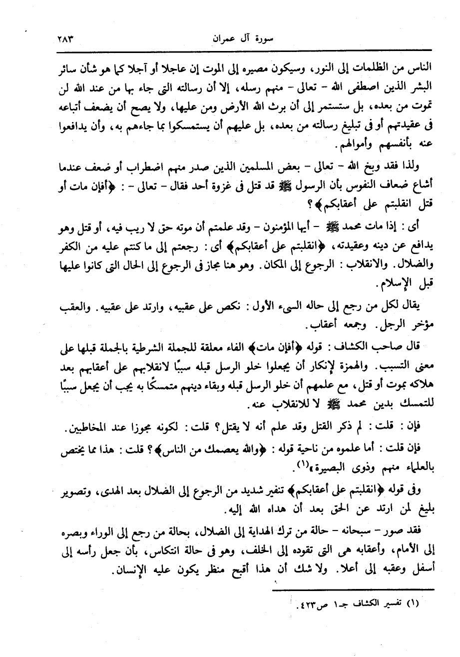 قال صاحب الكشاف: قوله أَفَإِنْ ماتَ الفاء معلقة للجملة الشرطية بالجملة قبلها على معنى التسبب. والهمزة لإنكار أن يجعلوا خلو الرسل قبله سببا لانقلابهم على أعقابهم بعد هلاكه بموت أو قتل، مع علمهم أن خلو الرسل قبله وبقاء دينهم متمسكا به يجب أن يجعل سببا للتمسك بدين محمد صلّى الله عليه وسلّم لا للانقلاب عنه.