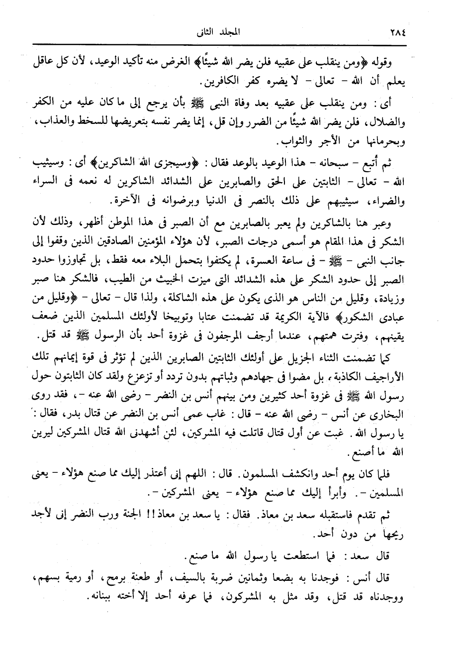 كما تضمنت الثناء الجزيل على أولئك الثابتين الصابرين الذين لم تؤثر في قوة إيمانهم تلك الأراجيف الكاذبة، بل مضوا في جهادهم وثباتهم بدون تردد أو تزعزع ولقد كان الثابتون حول رسول الله صلّى الله عليه وسلّم في غزوة أحد كثيرين ومن بينهم أنس بن النضر- رضى الله عنه-، فقد روى البخاري عن أنس- رضى الله عنه- قال: غاب عمى أنس بن النضر عن قتال بدر، فقال: