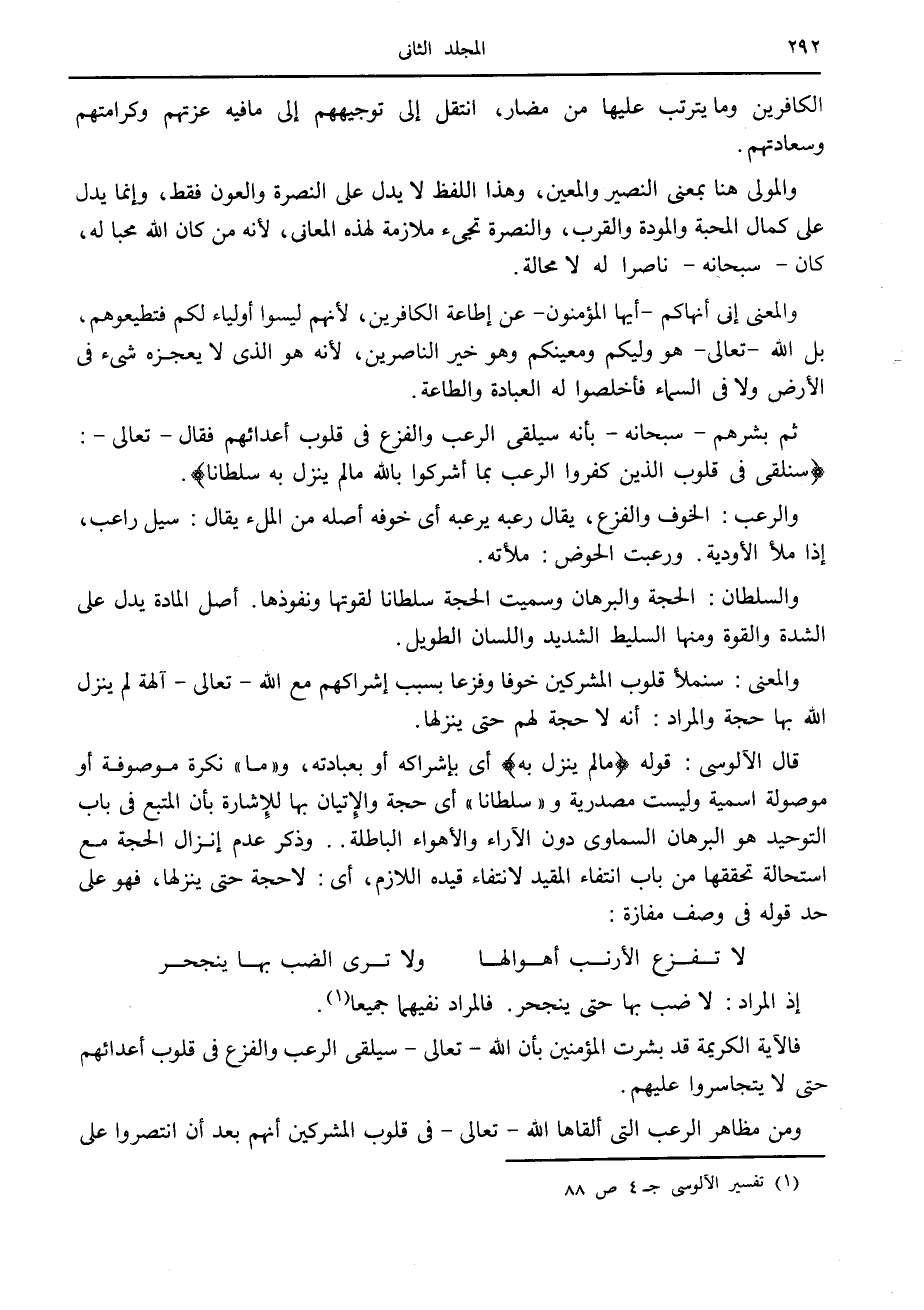 سَنُلْقِي فِي قُلُوبِ الَّذِينَ كَفَرُوا الرُّعْبَ بِما أَشْرَكُوا بِاللَّهِ ما لَمْ يُنَزِّلْ بِهِ سُلْطاناً.