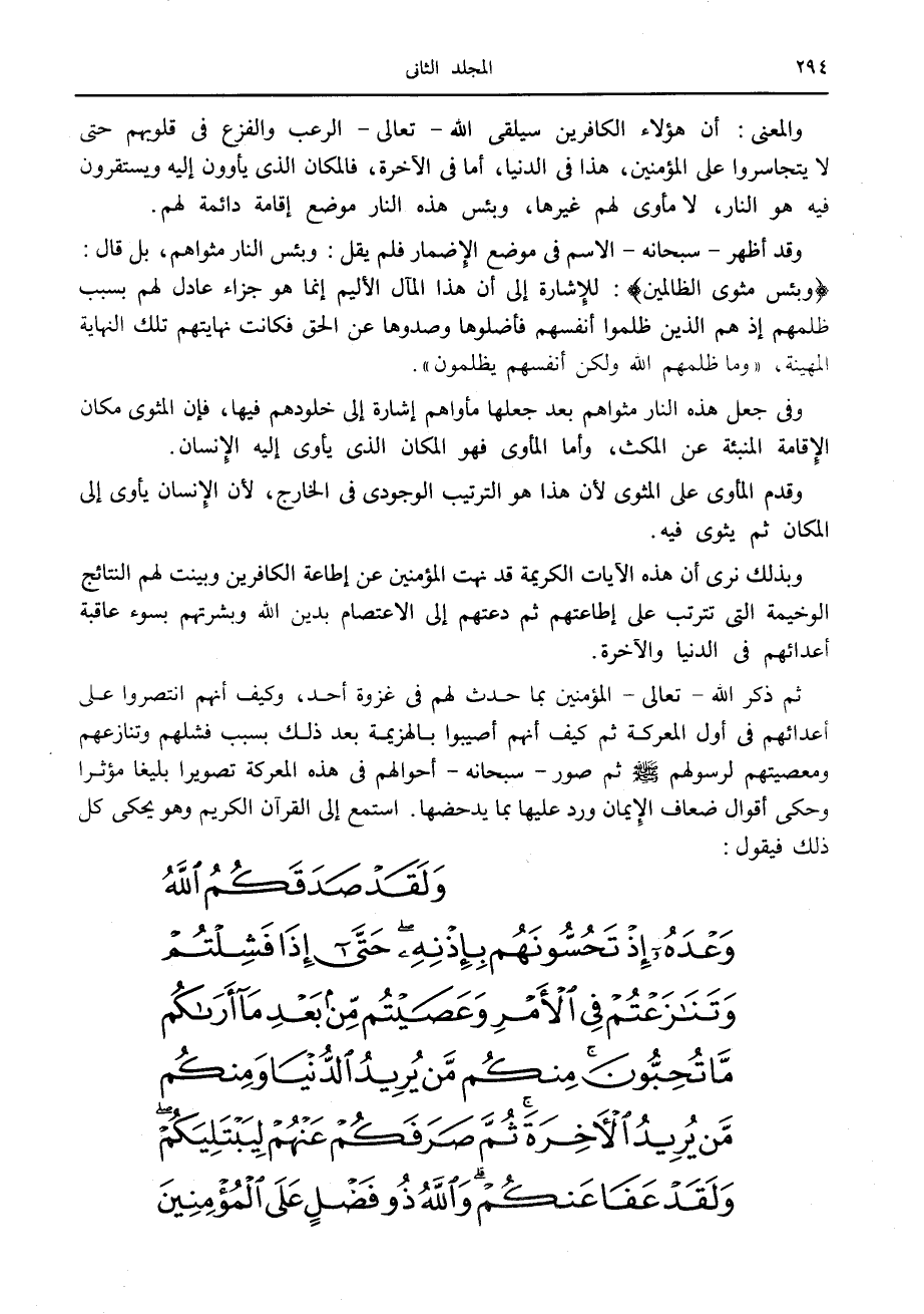 ثم ذكر الله- تعالى- المؤمنين بما حدث لهم في غزوة أحد، وكيف أنهم انتصروا على أعدائهم في أول المعركة ثم كيف أنهم أصيبوا بالهزيمة بعد ذلك بسبب فشلهم وتنازعهم ومعصيتهم لرسولهم صلّى الله عليه وسلّم ثم صور- سبحانه- أحوالهم في هذه المعركة تصويرا بليغا مؤثرا وحكى أقوال ضعاف الإيمان ورد عليها بما يدحضها. استمع إلى القرآن الكريم وهو يحكى كل ذلك فيقول: