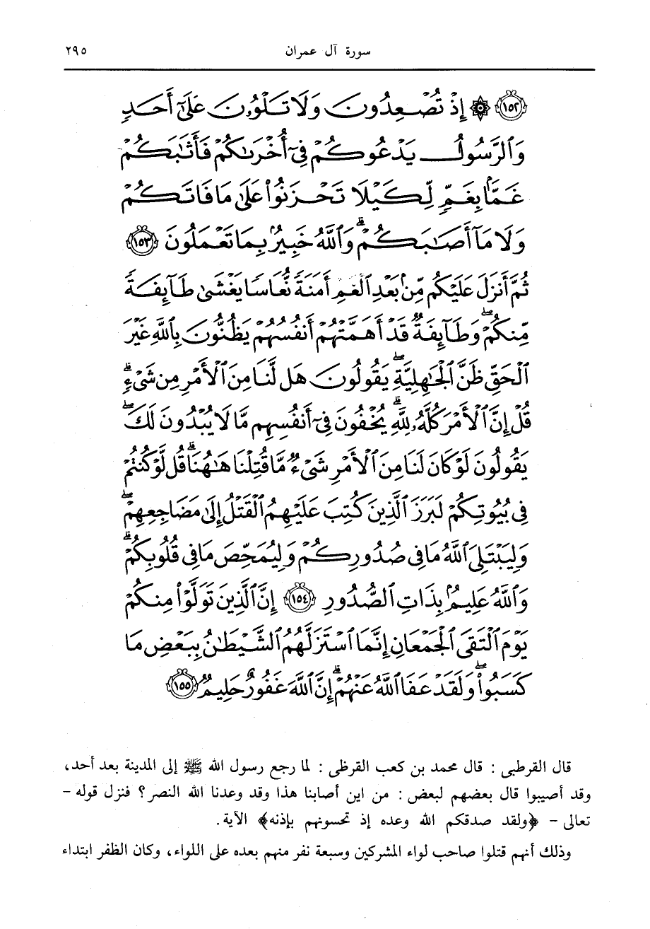 وَلَقَدْ صَدَقَكُمُ اللَّهُ وَعْدَهُ إِذْ تَحُسُّونَهُمْ بِإِذْنِهِ حَتَّى إِذا فَشِلْتُمْ وَتَنازَعْتُمْ فِي الْأَمْرِ وَعَصَيْتُمْ مِنْ بَعْدِ ما أَراكُمْ ما تُحِبُّونَ مِنْكُمْ مَنْ يُرِيدُ الدُّنْيا وَمِنْكُمْ مَنْ يُرِيدُ الْآخِرَةَ ثُمَّ صَرَفَكُمْ عَنْهُمْ لِيَبْتَلِيَكُمْ وَلَقَدْ عَفا عَنْكُمْ وَاللَّهُ ذُو فَضْلٍ عَلَى الْمُؤْمِنِينَ (152) إِذْ تُصْعِدُونَ وَلا تَلْوُونَ عَلى أَحَدٍ وَالرَّسُولُ يَدْعُوكُمْ فِي أُخْراكُمْ فَأَثابَكُمْ غَمًّا بِغَمٍّ لِكَيْلا تَحْزَنُوا عَلى ما فاتَكُمْ وَلا ما أَصابَكُمْ وَاللَّهُ خَبِيرٌ بِما تَعْمَلُونَ (153) ثُمَّ أَنْزَلَ عَلَيْكُمْ مِنْ بَعْدِ الْغَمِّ أَمَنَةً نُعاساً يَغْشى طائِفَةً مِنْكُمْ وَطائِفَةٌ قَدْ أَهَمَّتْهُمْ أَنْفُسُهُمْ يَظُنُّونَ بِاللَّهِ غَيْرَ الْحَقِّ ظَنَّ الْجاهِلِيَّةِ يَقُولُونَ هَلْ لَنا مِنَ الْأَمْرِ مِنْ شَيْءٍ قُلْ إِنَّ الْأَمْرَ كُلَّهُ لِلَّهِ يُخْفُونَ فِي أَنْفُسِهِمْ ما لا يُبْدُونَ لَكَ يَقُولُونَ لَوْ كانَ لَنا مِنَ الْأَمْرِ شَيْءٌ ما قُتِلْنا هاهُنا قُلْ لَوْ كُنْتُمْ فِي بُيُوتِكُمْ لَبَرَزَ الَّذِينَ كُتِبَ عَلَيْهِمُ الْقَتْلُ إِلى مَضاجِعِهِمْ وَلِيَبْتَلِيَ اللَّهُ ما فِي صُدُورِكُمْ وَلِيُمَحِّصَ ما فِي قُلُوبِكُمْ وَاللَّهُ عَلِيمٌ بِذاتِ الصُّدُورِ (154) إِنَّ الَّذِينَ تَوَلَّوْا مِنْكُمْ يَوْمَ الْتَقَى الْجَمْعانِ إِنَّمَا اسْتَزَلَّهُمُ الشَّيْطانُ بِبَعْضِ ما كَسَبُوا وَلَقَدْ عَفَا اللَّهُ عَنْهُمْ إِنَّ اللَّهَ غَفُورٌ حَلِيمٌ (155)