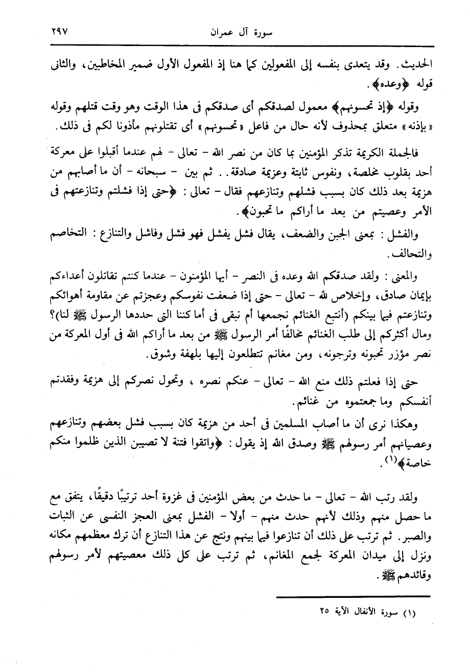 والمعنى: ولقد صدقكم الله وعده في النصر- أيها المؤمنون- عند ما كنتم تقاتلون أعداءكم بإيمان صادق، وإخلاص الله- تعالى- حتى إذا ضعفت نفوسكم وعجزتم عن مقاومة أهوائكم وتنازعتم فيما بينكم (أنتبع الغنائم نجمعها أم نبقى في أماكننا التي حددها الرسول صلّى الله عليه وسلّم لنا) ؟
