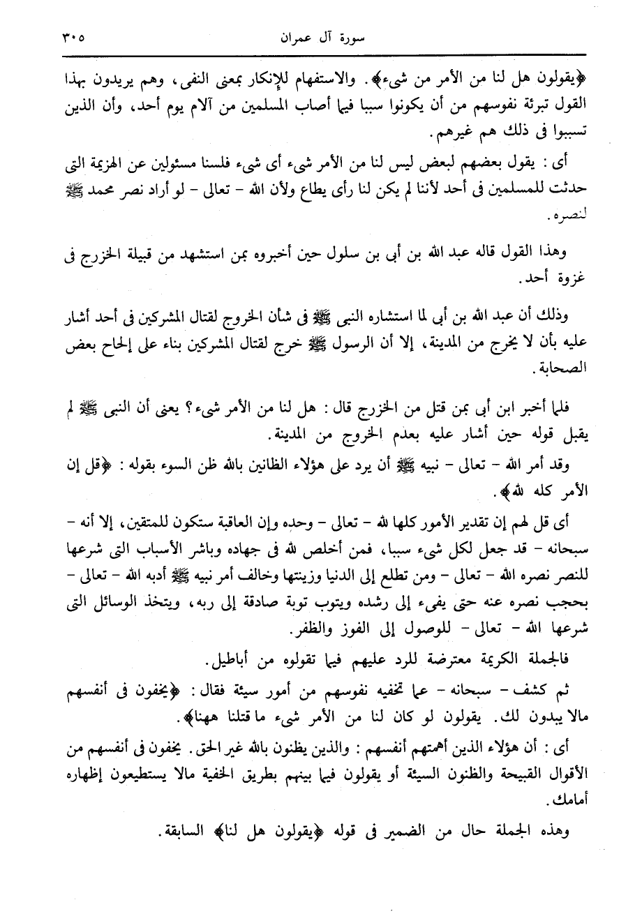 ثم كشف- سبحانه- عما تخفيه نفوسهم من أمور سيئة فقال: يُخْفُونَ فِي أَنْفُسِهِمْ ما لا يُبْدُونَ لَكَ. يَقُولُونَ لَوْ كانَ لَنا مِنَ الْأَمْرِ شَيْءٌ ما قُتِلْنا هاهُنا.