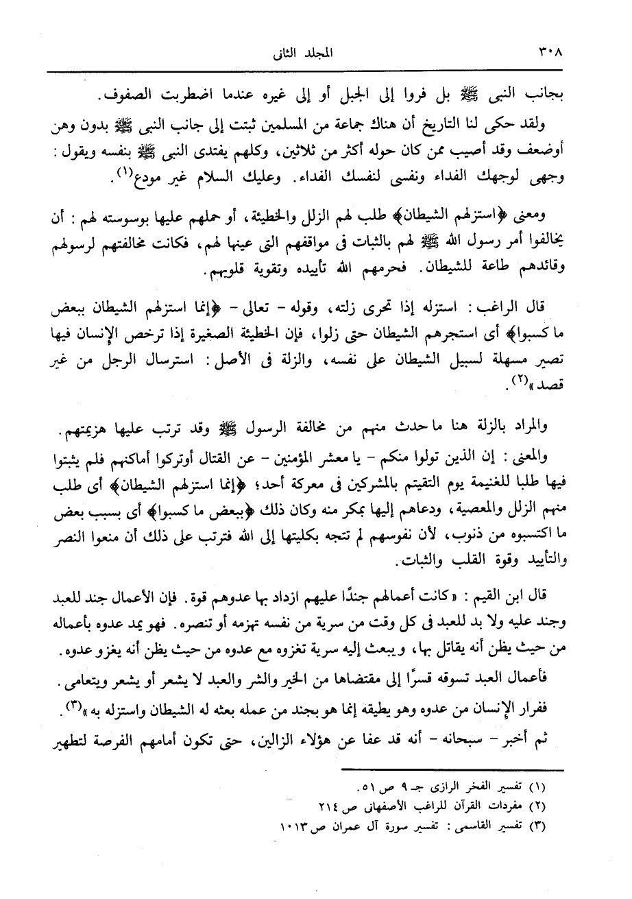 ومعنى اسْتَزَلَّهُمُ الشَّيْطانُ طلب لهم الزلل والخطيئة، أو حملهم عليها بوسوسته لهم: أن يخالفوا أمر رسول الله صلّى الله عليه وسلّم لهم بالثبات في مواقفهم التي عينها لهم، فكانت مخالفتهم لرسولهم وقائدهم طاعة للشيطان. فحرمهم الله تأييده وتقوية قلوبهم.