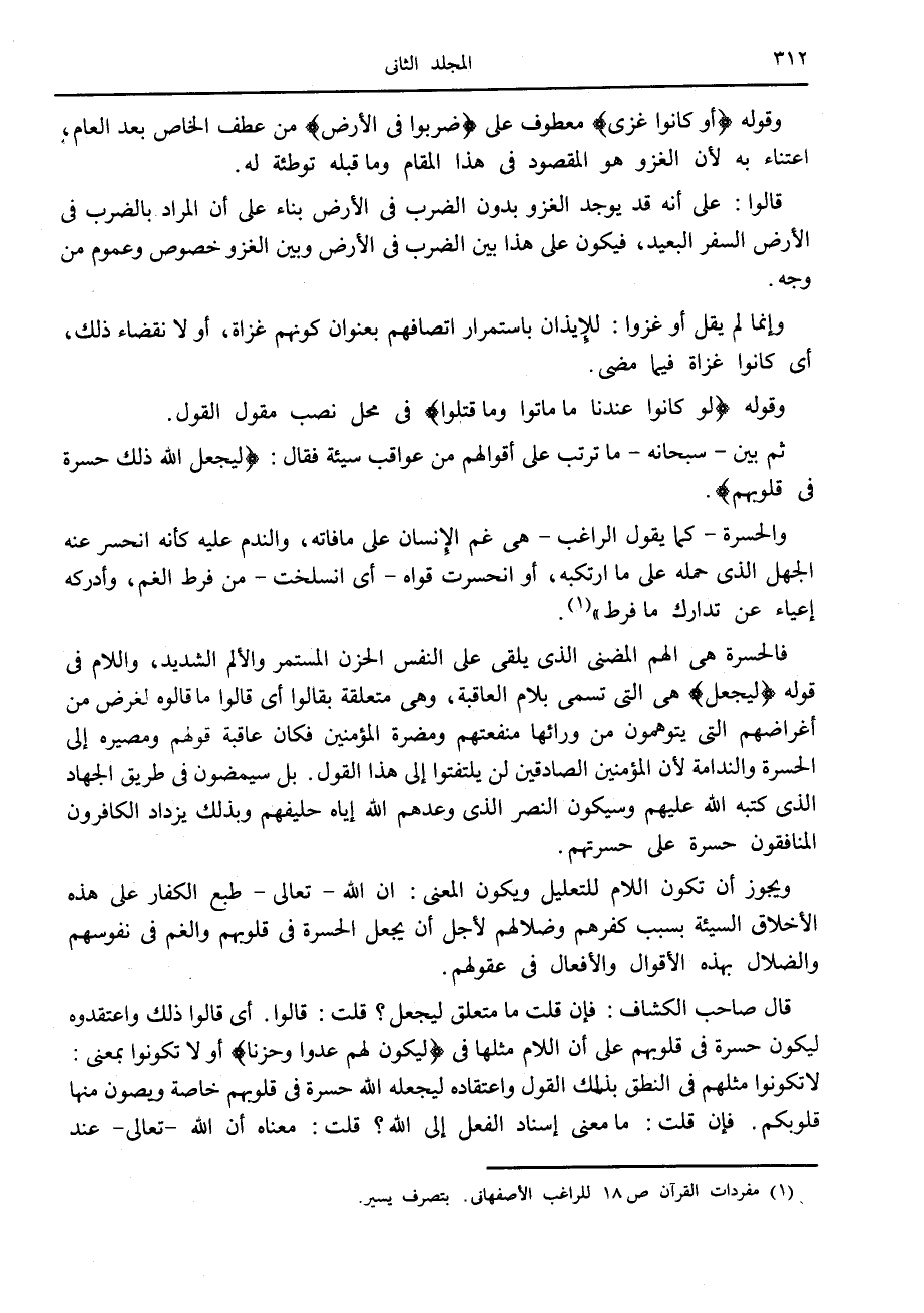 فالحسرة هي الهم المضنى الذي يلقى على النفس الحزن المستمر والألم الشديد، واللام في قوله لِيَجْعَلَ هي التي تسمى بلام العاقبة، وهي متعلقة بقالوا أى قالوا ما قالوه لغرض من أغراضهم التي يتوهمون من ورائها منفعتهم ومضرة المؤمنين فكان عاقبة قولهم ومصيره إلى الحسرة والندامة لأن المؤمنين الصادقين لن يلتفتوا إلى هذا القول. بل سيمضون في طريق الجهاد الذي كتبه الله عليهم وسيكون النصر الذي وعدهم الله إياه حليفهم وبذلك يزداد الكافرون المنافقون حسرة على حسرتهم.