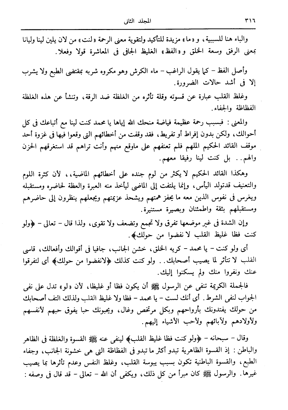 وقال- سبحانه- وَلَوْ كُنْتَ فَظًّا غَلِيظَ الْقَلْبِ لينفى عنه صلّى الله عليه وسلّم القسوة والغلظة في الظاهر والباطن: إذ القسوة الظاهرية تبدو أكثر ما تبدو في الفظاظة التي هي خشونة الجانب، وجفاء الطبع، والقسوة الباطنية تكون بسبب يبوسة القلب، وغلظ النفس وعدم تأثرها بما يصيب غيرها. والرسول صلّى الله عليه وسلّم كان مبرأ من كل ذلك، ويكفى أن الله- تعالى- قد قال في وصفه: