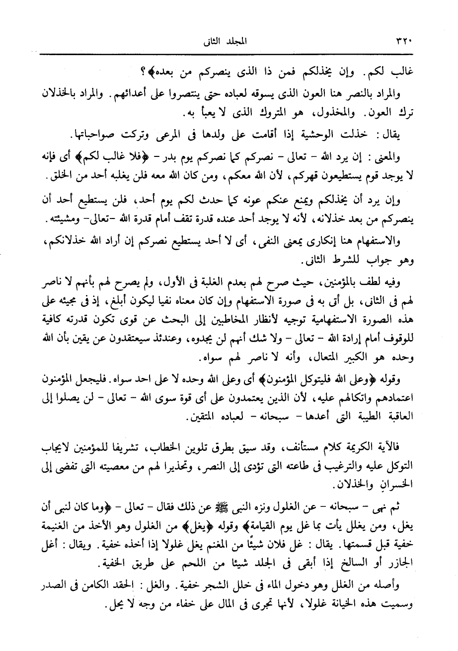 إِنْ يَنْصُرْكُمُ اللَّهُ فَلا غالِبَ لَكُمْ. وَإِنْ يَخْذُلْكُمْ فَمَنْ ذَا الَّذِي يَنْصُرُكُمْ مِنْ بَعْدِهِ؟