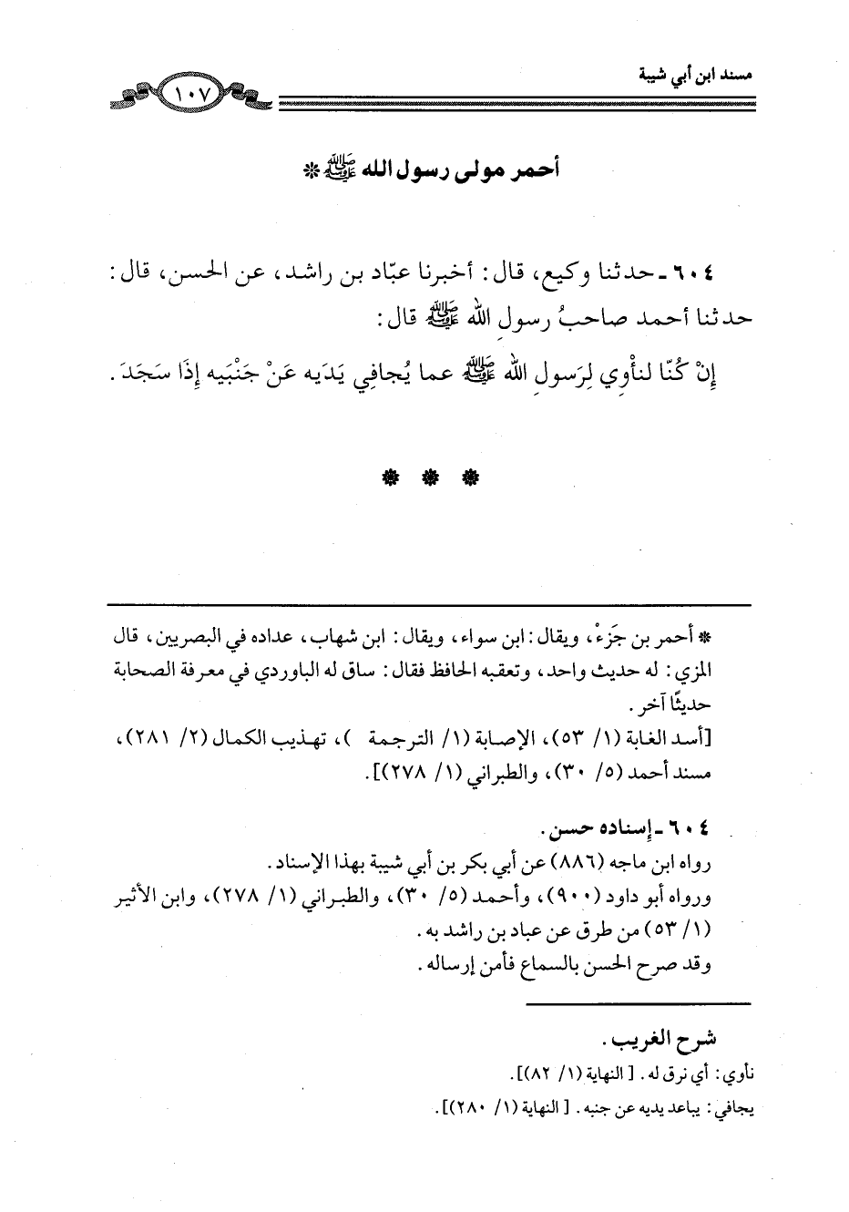 604 - حَدَّثَنَا وَكِيعٌ، قَالَ: أَخْبَرَنَا عَبَّادُ بْنُ رَاشِدٍ، عَنْ الْحَسَنِ، قَالَ: حَدَّثَنَا أَحْمَرُ، صَاحِبُ رَسُولِ اللَّهِ صَلَّى اللهُ عَلَيْهِ وَسَلَّمَ قَالَ: «إِنْ كُنَّا §لَنَأْوِي لِرَسُولِ اللَّهِ صَلَّى اللهُ عَلَيْهِ وَسَلَّمَ عَمَّا يُجَافِي يَدَيْهِ عَنْ جَنْبَيْهِ إِذَا سَجَدَ»
