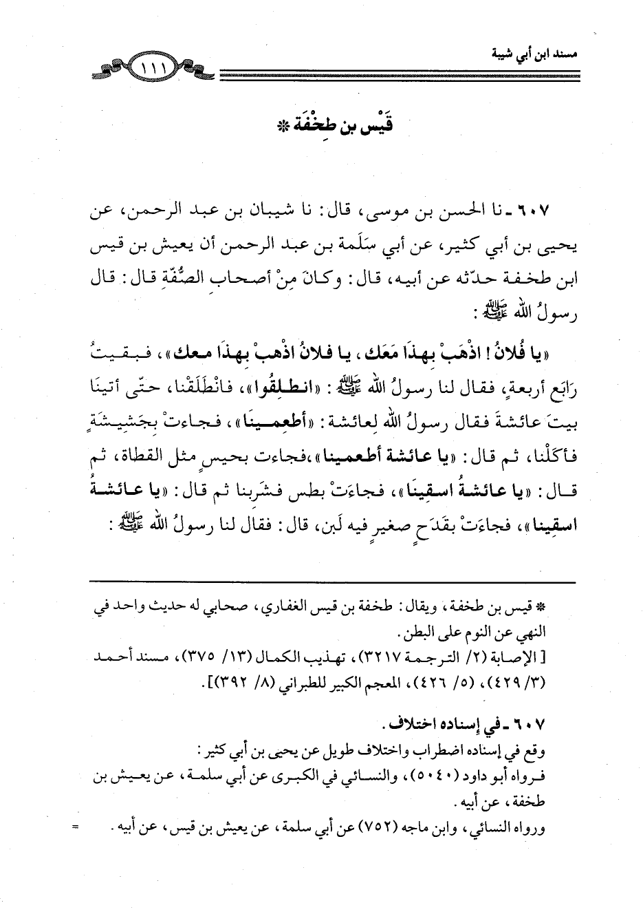 607 - نا الْحَسَنُ بْنُ مُوسَى، قَالَ: نا شَيْبَانُ بْنُ عَبْدِ الرَّحْمَنِ، عَنْ يَحْيَى بْنِ أَبِي كَثِيرٍ، عَنْ أَبِي سَلَمَةَ بْنِ عَبْدِ الرَّحْمَنِ، أَنَّ يَعِيشَ بْنَ قَيْسِ بْنِ طِخْفَةَ، حَدَّثَهُ، عَنْ أبيه، قَالَ: وَكَانَ مِنْ أَصْحَابِ الصُّفَّةِ قَالَ: قَالَ رَسُولُ اللَّهِ صَلَّى اللهُ عَلَيْهِ وَسَلَّمَ: «يَا فُلَانُ، اذْهَبْ بِهَذَا مَعَكَ، يَا فُلَانُ اذْهَبْ بِهَذَا مَعَكَ» ، فَبَقِيتُ رَابِعَ أَرْبَعَةٍ، فَقَالَ لَنَا رَسُولُ اللَّهِ صَلَّى اللهُ عَلَيْهِ وَسَلَّمَ: «انْطَلِقُوا» ، فَانْطَلَقْنَا، حَتَّى أَتَيْنَا بَيْتَ عَائِشَةَ فَقَالَ رَسُولُ اللَّهِ لِعَائِشَةَ: «أَطْعِمِينَا» ، فَجَاءَتْ بِجَشِيشِةٍ فَأَكَلْنَا، ثُمَّ قَالَ: «يَا عَائِشَةُ أَطْعِمِينَا» ، فَجَاءَتْ بِحَيْسٍ مِثْلِ الْقَطَاةِ، ثُمَّ قَالَ: «يَا عَائِشَةُ اسْقِينَا» ، فَجَاءَتْ بِطُسٍّ فَشَرِبْنَا، ثُمَّ قَالَ: «يَا عَائِشَةُ اسْقِينَا» فَجَاءَتْ بِقَدَحٍ صَغِيرٍ فِيهِ لَبَنٌ، قَالَ: فَقَالَ لَنَا رَسُولُ اللَّهِ صَلَّى اللهُ عَلَيْهِ وَسَلَّمَ -[112]-: «إِنْ شِئْتُمْ نِمْتُمْ هَاهُنَا، وَإِنْ شِئْتُمُ انْطَلَقْتُمْ إِلَى الْمَسْجِدِ» قَالَ: فَقُلْنَا: بَلْ نَنْطَلِقُ إِلَى الْمَسْجِدِ، قَالَ: فَبَيْنَا أَنَا §نَائِمٌ عَلَى بَطْنِي فِي الْمَسْجِدِ دَفَعَنِي رَجُلٌ بِرِجْلِهِ فَقَالَ هَكَذَا: «فَإِنَّ هَذِهِ ضِجْعَةٌ يَبْغَضُهَا اللَّهُ» قَالَ: فَرَفَعْتُ رَأْسِي، فَإِذَا هُوَ رَسُولُ اللَّهِ صَلَّى اللهُ عَلَيْهِ وَسَلَّمَ