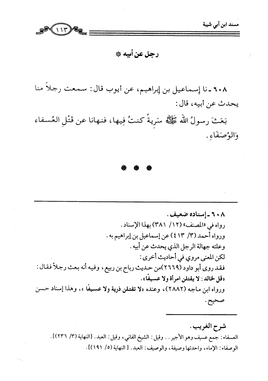 608 - نا إِسْمَاعِيلُ بْنُ إِبْرَاهِيمَ، عَنْ أَيُّوبَ، قَالَ: سَمِعْتُ رَجُلًا، مِنَّا يُحَدِّثُ، عَنْ أَبِيهِ، قَالَ: بَعَثَ رَسُولُ اللَّهِ صَلَّى اللهُ عَلَيْهِ وَسَلَّمَ سَرِيَّةً كُنْتُ فِيهَا، «§فَنَهَانَا عَنْ قَتْلِ الْعُسَفَاءِ وَالْوُصَفَاءِ»