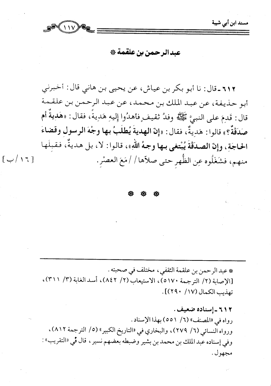 612 - قَالَ: نا أَبُو بَكْرِ بْنُ عَيَّاشٍ، عَنْ يَحْيَى بْنِ هَانِي، قَالَ: أَخْبَرَنِي أَبُو حُذَيْفَةَ، عَنْ عَبْدِ الْمَلِكِ بْنِ مُحَمَّدٍ، عَنْ عَبْدِ الرَّحْمَنِ بْنِ عَلْقَمَةَ، قَالَ: قَدِمَ عَلَى النَّبِيِّ صَلَّى اللهُ عَلَيْهِ وَسَلَّمَ وَفْدُ ثَقِيفٍ فَأَهْدَوا إِلَيْهِ هَدِيَّةً، فَقَالَ: «هَدِيَّةٌ أَوْ صَدَقَةٌ؟» قَالُوا: هَدِيَّةٌ، فَقَالَ: «إِنَّ §الْهَدِيَّةَ يُطْلَبُ بِهَا وَجْهُ الرَّسُولِ وَقَضَاءُ الْحَاجَةِ، وَإِنَّ الصَّدَقَةَ يُبْتَغَى بِهَا وَجْهُ اللَّهِ» ، قَالُوا: لَا، بَلْ هَدِيَّةٌ، فَقَبِلَهَا مِنْهُمْ، فَشُغِلُوا عَنِ الظُّهْرِ حَتَّى صَلَّاهَا مَعَ الْعَصْرِ
