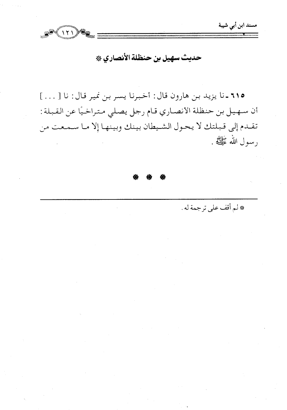 615 - نا يَزِيدُ بْنُ هَارُونَ، قَالَ: أَخْبَرَنَا بِشْرُ بْنُ نُمَيْرٍ، قَالَ: نا أَنَّ سُهَيْلَ بْنَ حَنْظَلَةَ الْأَنْصَارِيَّ، قَالَ لرَجُلٍ يُصَلِّي مُتَرَاخِيًا عَنِ الْقِبْلَةِ: «§تَقَدَّمْ إِلَى قِبْلَتِكَ لَا يَحُولُ الشَّيْطَانُ بَيْنَكَ وَبَيْنَهَا إِلَّا مَا سَمِعْتُ مِنَ رَسُولِ اللَّهِ صَلَّى اللهُ عَلَيْهِ وَسَلَّمَ»