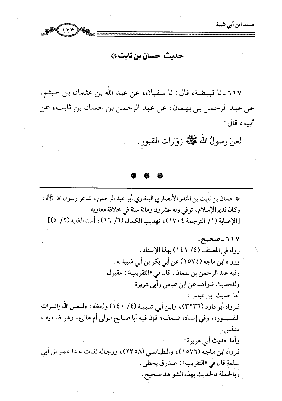 617 - نا قَبِيصَةُ، قَالَ: نا سُفْيَانُ، عَنْ عَبْدِ اللَّهِ بْنِ عُثْمَانَ بْنِ خَيْثَمٍ، عَنْ عَبْدِ الرَّحْمَنِ بْنِ بَهْمَانَ، عَنْ عَبْدِ الرَّحْمَنِ بْنِ حَسَّانَ بْنِ ثَابِتٍ، عَنْ أَبِيهِ، قَالَ: «§لَعَنَ رَسُولُ اللَّهِ صَلَّى اللهُ عَلَيْهِ وَسَلَّمَ زَوَّارَاتِ الْقُبُورِ»