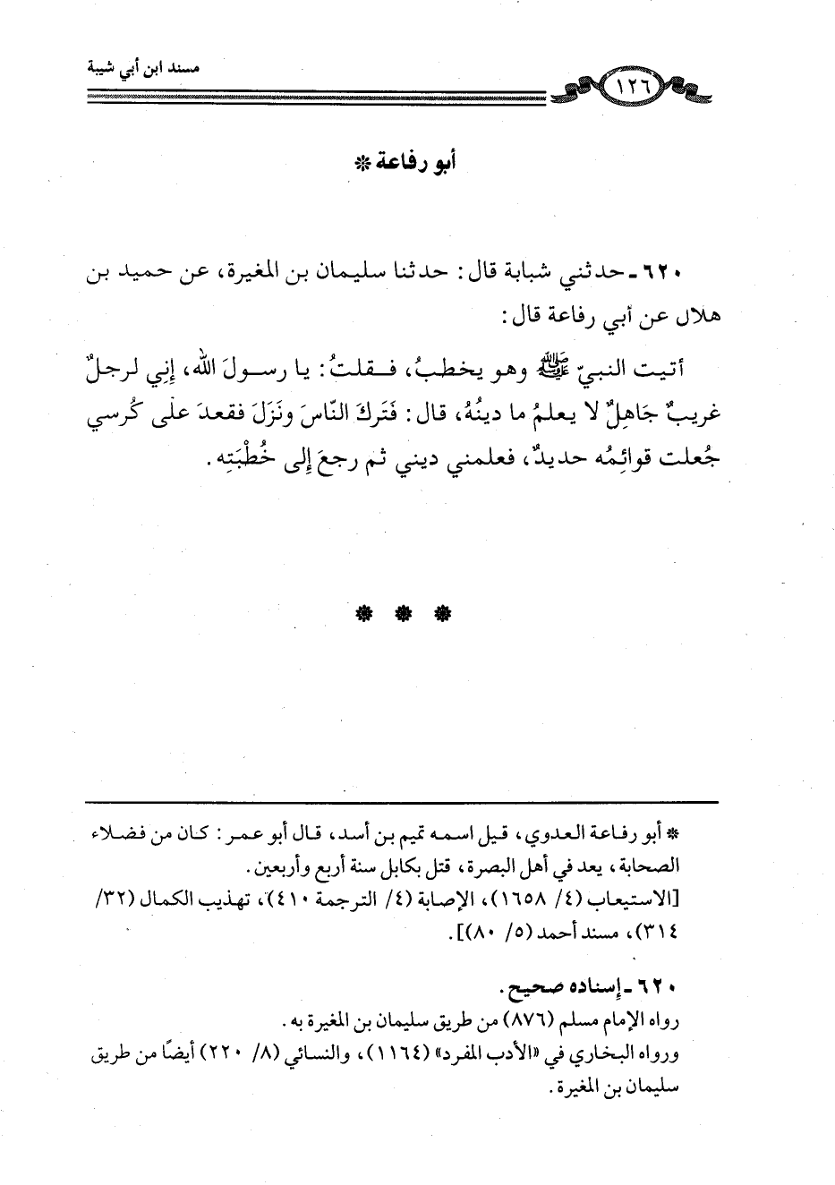 620 - حَدَّثَنِي شَبَابَةُ، قَالَ: حَدَّثَنَا سُلَيْمَانُ بْنُ الْمُغِيرَةِ، عَنْ حُمَيْدِ بْنِ هِلَالٍ، عَنْ أَبِي رِفَاعَةَ، قَالَ: أَتَيْتُ النَّبِيَّ صَلَّى اللهُ عَلَيْهِ وَسَلَّمَ وَهُوَ يَخْطُبُ، فَقُلْتُ: يَا رَسُولَ اللَّهِ، إِنِّي لَرَجُلٌ غَرِيبٌ جَاهِلٌ لَا يَعْلَمُ مَا دِينُهُ؟ قَالَ: «§فَتَرَكَ النَّاسَ وَنَزَلَ فَقَعَدَ عَلَى كُرْسِيٍّ جُعِلَتْ قَوَائِمُهُ حَدِيدًا، فَعَلَّمَنِي دِينِي ثُمَّ رَجَعَ إِلَى خُطْبَتِهِ»