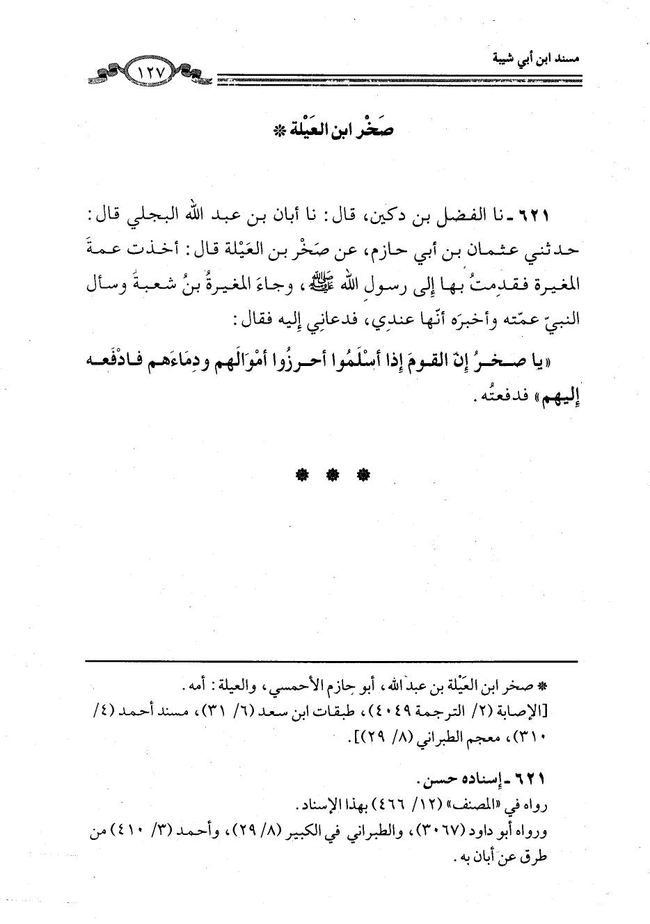 621 - نا الْفَضْلُ بْنُ دُكَيْنٍ، قَالَ: نا أَبَانُ بْنُ عَبْدِ اللَّهِ الْبَجَلِيُّ، قَالَ: حَدَّثَنِي عُثْمَانُ بْنُ أَبِي حَازِمٍ، عَنْ صَخْرِ بْنِ الْعَيْلَةِ، قَالَ: أَخَذْتُ عَمَّةَ الْمُغِيرَةِ فَقَدِمْتُ بِهَا إِلَى رَسُولِ اللَّهِ صَلَّى اللهُ عَلَيْهِ وَسَلَّمَ، وَجَاءَ الْمُغِيرَةُ بْنُ شُعْبَةَ وَسَأَلَ النَّبِيَّ عَمَّتَهُ وَأَخْبَرَهُ أَنَّهَا عِنْدِي، فَدَعَانِي إِلَيْهِ فَقَالَ: «يَا صَخْرُ، إِنَّ §الْقَوْمَ إِذَا أَسْلَمُوا أَحْرَزُوا أَمْوَالَهُمْ وَدِمَاءَهُمْ فَادْفَعْهُ إِلَيْهِمْ» فَدَفَعْتُهُ
