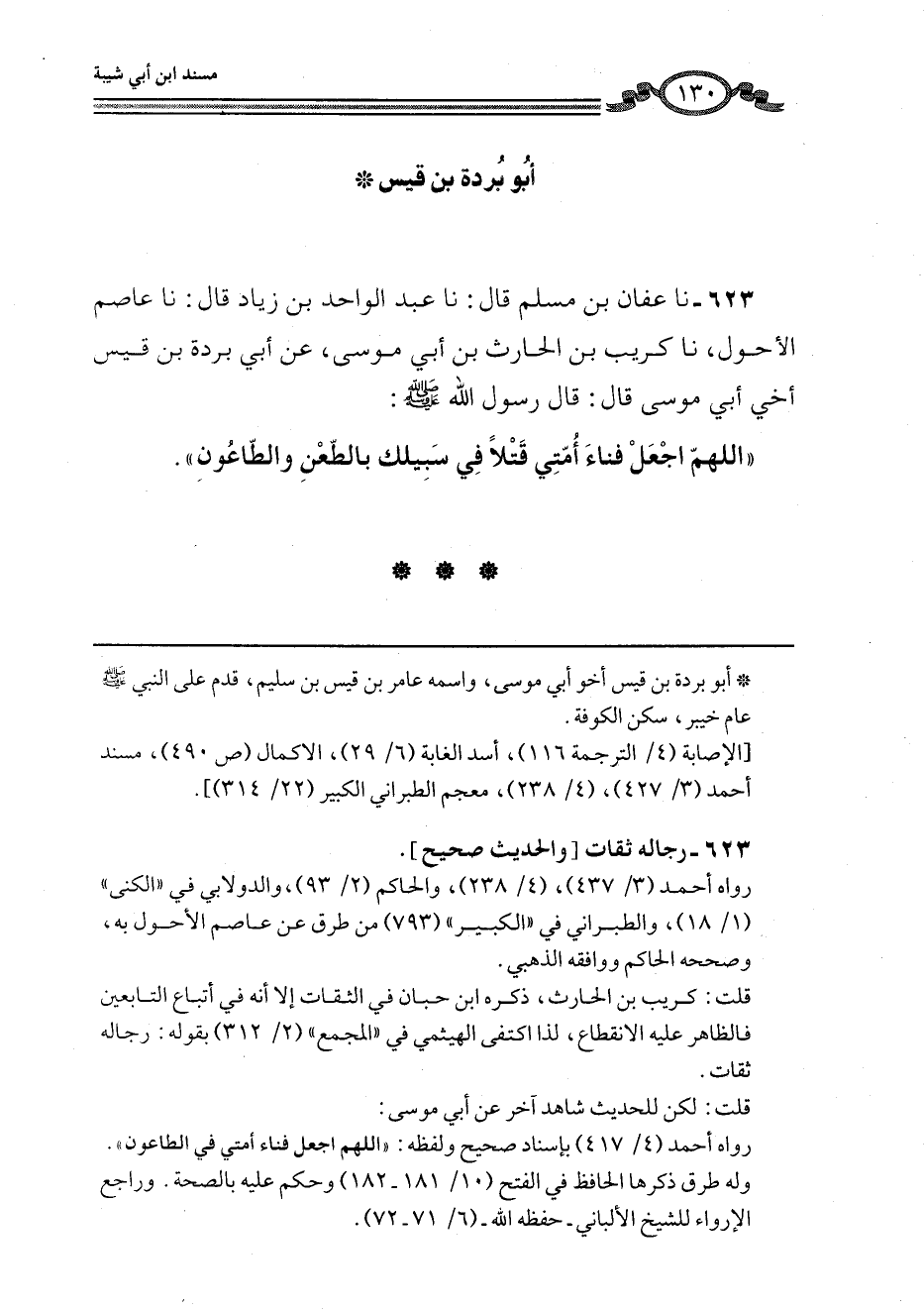 623 - نا عَفَّانُ بْنُ مُسْلِمٍ، نا عَبْدُ الْوَاحِدِ بْنُ زِيَادٍ، قَالَ: نا عَاصِمٌ الْأَحْوَلُ، نا كُرَيْبُ بْنُ الْحَارِثِ بْنِ أَبِي مُوسَى، عَنْ أَبِي بُرْدَةَ بْنِ قَيْسٍ، أَخِي أَبِي مُوسَى قَالَ: قَالَ رَسُولُ اللَّهِ صَلَّى اللهُ عَلَيْهِ وَسَلَّمَ: «§اللَّهُمَّ اجْعَلْ فَنَاءَ أُمَّتِي قَتْلًا فِي سَبِيلِكَ بِالطَّعْنِ وَالطَّاعُونِ»
