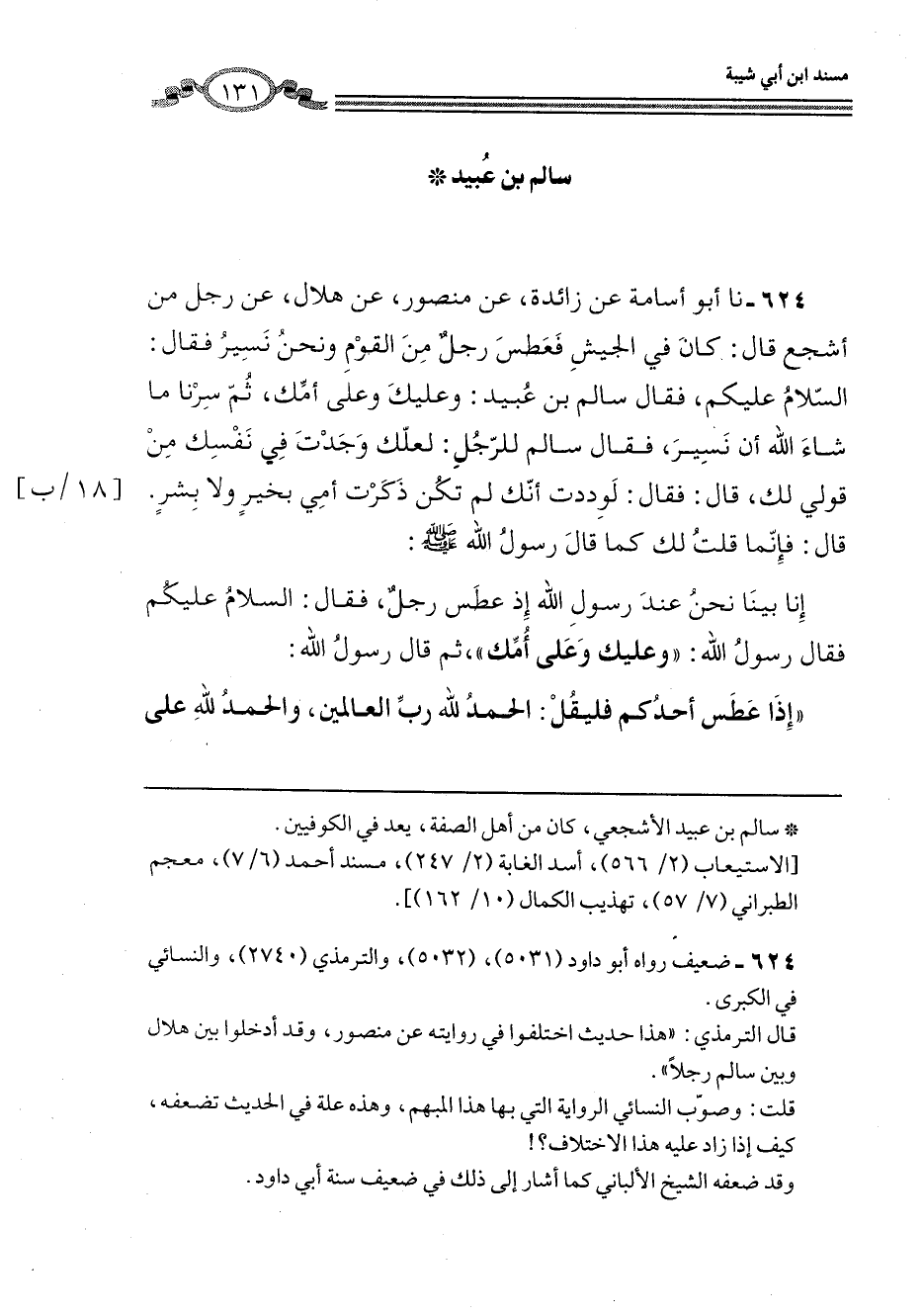 624 - نا أَبُو أُسَامَةَ، عَنْ زَائِدَةَ، عَنْ مَنْصُورٍ، عَنْ هِلَالٍ، عَنْ رَجُلٍ مِنْ أَشْجَعَ، قَالَ: كَانَ فِي الْجَيْشِ فَعَطَسَ رَجُلٌ مِنَ الْقَوْمِ وَنَحْنُ نَسِيرُ فَقَالَ: السَّلَامُ عَلَيْكُمْ، فَقَالَ سَالِمُ بْنُ عُبَيْدٍ: وَعَلَيْكَ وَعَلَى أُمِّكَ، ثُمَّ سِرْنَا مَا شَاءَ اللَّهُ أَنْ نَسِيرَ، فَقَالَ سَالِمٌ لِلرَّجُلِ: لَعَلَّكَ وَجَدْتَ فِي نَفْسِكَ مِنْ قَوْلِي لَكَ؟ قَالَ: فَقَالَ: لَوَدِدْتُ أَنَّكَ لَمْ تَكُنْ ذَكَرْتَ أُمِّي بِخَيْرٍ وَلَا بِشَرٍّ، قَالَ: فَإِنَّمَا قُلْتُ لَكَ كَمَا قَالَ رَسُولُ اللَّهِ صَلَّى اللهُ عَلَيْهِ وَسَلَّمَ: إِنَّا بَيْنَا نَحْنُ عِنْدَ رَسُولِ اللَّهِ إِذْ عَطَسَ رَجُلٌ، فَقَالَ: السَّلَامُ عَلَيْكُمْ، فَقَالَ رَسُولُ اللَّهِ صَلَّى اللهُ عَلَيْهِ وَسَلَّمَ: «وَعَلَيْكَ وَعَلَى أُمِّكَ» ، ثُمَّ قَالَ رَسُولُ اللَّهِ: " §إِذَا عَطَسَ أَحَدُكُمْ فَلْيَقُلِ: الْحَمْدُ لِلَّهِ رَبِّ الْعَالَمِينَ، وَالْحَمْدُ لِلَّهِ عَلَى -[132]- كُلِّ حَالٍ " ذَكَرَ بَعْضَ مَحَامِدِ اللَّهِ مَنْصُورٌ لِقَوْلِهِ: وَلَا يَحْفَظُ مَنْصُورٌ كَيْفَ قَالَ، ثُمَّ قَالَ: " لِيَرُدَّ عَلَيْهِ مَنْ عِنْدَهُ: يَرْحَمُكَ اللَّهُ، ثُمَّ لِيَرُدَّ عَلَيْهِمْ: يَغْفِرُ اللَّهُ لِي وَلَكُمْ "