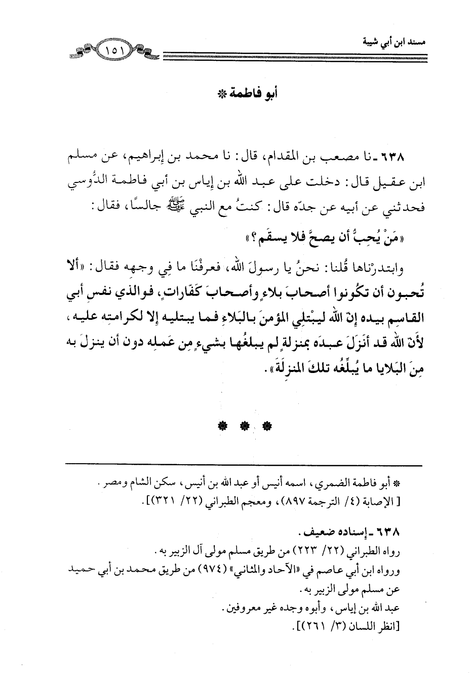 638 - نا مُصْعَبُ بْنُ الْمِقْدَامِ، قَالَ: نا مُحَمَّدُ بْنُ إِبْرَاهِيمَ، عَنْ مُسْلِمِ بْنِ عَقِيلٍ، قَالَ: دَخَلْتُ عَلَى عَبْدِ اللَّهِ بْنِ إِيَاسِ بْنِ أَبِي فَاطِمَةَ الدَّوْسِيِّ، فَحَدَّثَنِي عَنْ أَبِيهِ، عَنْ جَدِّهِ، قَالَ: كُنْتُ مَعَ النَّبِيِّ صَلَّى اللهُ عَلَيْهِ وَسَلَّمَ جَالِسًا، فَقَالَ: «مَنْ يُحِبُّ أَنْ يَصِحَّ فَلَا يَسْقَمَ؟» وَابْتَدَرْنَاهَا قُلْنَا: نَحْنُ يَا رَسُولَ اللَّهِ، فَعَرَفْنَا مَا فِي وَجْهِهِ فَقَالَ: «أَلَا تُحِبُّونَ أَنْ تَكُونُوا أَصْحَابَ بَلَاءٍ وَأَصْحَابَ كَفَّارَاتٍ، فَوَالَّذِي نَفْسُ أَبِي الْقَاسِمِ بِيَدِهِ إِنَّ §اللَّهَ لَيَبْتَلِي الْمُؤْمِنَ بِالْبَلَاءِ فَمَا يَبْتَلِيهِ إِلَّا لِكَرَامَتِهِ عَلَيْهِ، لِأَنَّ اللَّهَ قَدْ أَنْزَلَ عَبْدَهُ بِمَنْزِلَةٍ لَمْ يَبْلُغْهَا بِشَيْءٍ مِنْ عَمَلِهِ دُونَ أَنْ يَنْزِلَ بِهِ مِنَ الْبَلَايَا مَا يُبَلِّغُهُ تِلْكَ الْمَنْزِلَةَ»