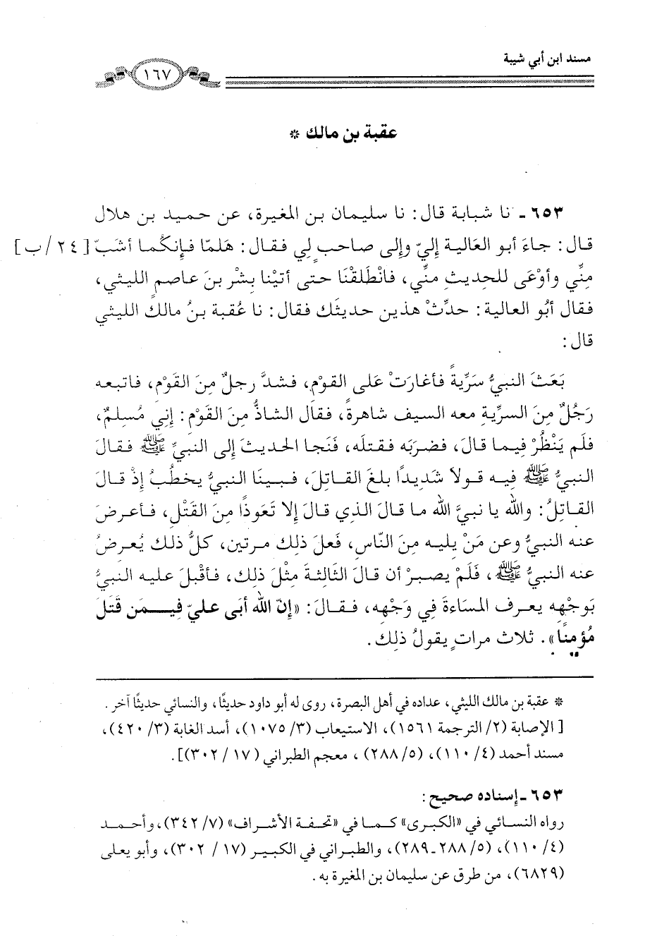 653 - نا شَبَابَةُ، قَالَ: نا سُلَيْمَانُ بْنُ الْمُغِيرَةِ، عَنْ حُمَيْدِ بْنِ هِلَالٍ، قَالَ: جَاءَ أَبُو الْعَالِيَةِ إِلَيَّ وَإِلَى صَاحِبٍ لِي فَقَالَ: هَلُمَّا فَإِنَّكُمَا أَشَبُّ مِنِّي وَأَوْعَى لِلْحَدِيثِ مِنِّي، فَانْطَلَقْنَا حَتَّى أَتَيْنَا بِشْرَ بْنَ عَاصِمٍ اللَّيْثِيَّ، فَقَالَ أَبُو الْعَالِيَةِ: حَدِّثْ هَذَيْنِ حَدِيثَكَ فَقَالَ: نا عُقْبَةُ بْنُ مَالِكٍ اللَّيْثِيُّ قَالَ: بَعَثَ النَّبِيُّ سَرِيَّةً فَأَغَارَتْ عَلَى الْقَوْمِ، فَشَدَّ رَجُلٌ مِنَ الْقَوْمِ فَاتَّبَعَهُ رَجُلٌ مِنَ السَّرِيَّةِ مَعَهُ السَّيْفُ شَاهِرَةً فَقَالَ الشَّاذُّ مِنَ الْقَوْمِ: إِنِّي مُسْلِمٌ، فَلَمْ يَنْظُرْ فِيمَا قَالَ، فَضَرَبَهُ فَقَتَلَهُ، فَنَجَا الْحَدِيثُ إِلَى النَّبِيِّ صَلَّى اللهُ عَلَيْهِ وَسَلَّمَ فَقَالَ النَّبِيُّ صَلَّى اللهُ عَلَيْهِ وَسَلَّمَ فِيهِ قَوْلًا شَدِيدًا بَلَغَ الْقَاتِلَ، فَبَيْنَا النَّبِيُّ يَخْطُبُ إِذْ قَالَ الْقَاتِلُ: وَاللَّهِ يَا نَبِيَّ اللَّهِ، مَا قَالَ الَّذِي قَالَ إِلَّا تَعَوُّذًا مِنَ الْقَتْلِ، فَأَعْرَضَ عَنْهُ النَّبِيُّ وَعَمَّنْ يَلِيهِ مِنَ النَّاسِ، فَعَلَ ذَلِكَ مَرَّتَيْنِ، كُلُّ ذَلِكَ يُعْرِضُ عَنْهُ النَّبِيُّ صَلَّى اللهُ عَلَيْهِ وَسَلَّمَ، فَلَمْ يَصْبِرْ أَنْ قَالَ الثَّالِثَةَ مِثْلَ ذَلِكَ، فَأَقْبَلَ عَلَيْهِ النَّبِيُّ بِوَجْهِهِ يُعْرَفُ الْمَسَاءَةُ فِي وَجْهِهِ، فَقَالُ: «إِنَّ §اللَّهَ أَبَى عَلَيَّ فِيمَنْ قَتَلَ مُؤْمِنًا» ثَلَاثَ مَرَّاتٍ يَقُولُ ذَلِكَ