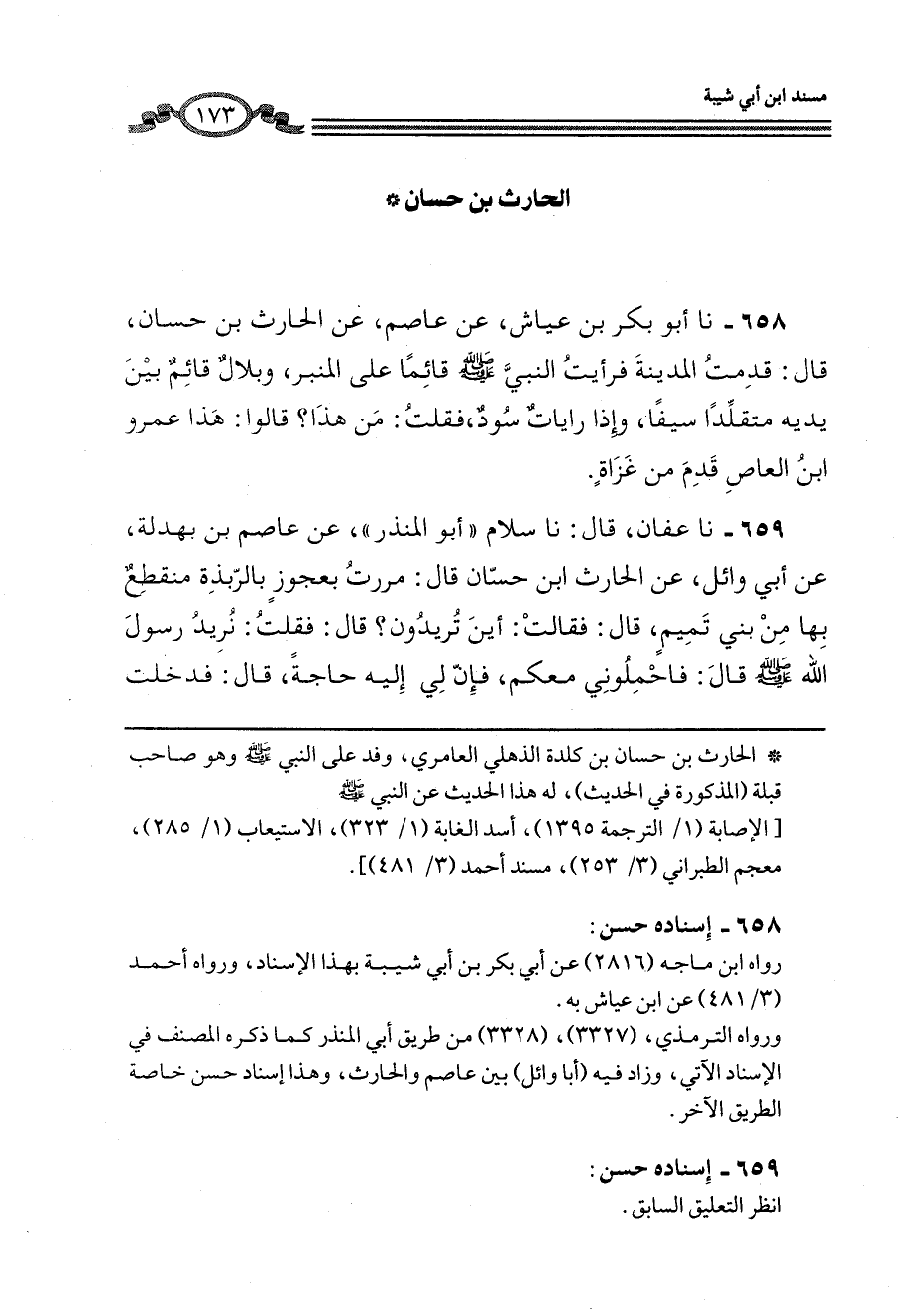 658 - نا أَبُو بَكْرِ بْنُ عَيَّاشٍ، عَنْ عَاصِمٍ، عَنِ الْحَارِثِ بْنِ حَسَّانَ، قَالَ: قَدِمْتُ الْمَدِينَةَ «فَرَأَيْتُ النَّبِيَّ صَلَّى اللهُ عَلَيْهِ وَسَلَّمَ §قَائِمًا عَلَى الْمِنْبَرِ، وَبِلَالٌ قَائِمٌ بَيْنَ يَدَيْهِ مُتَقَلِّدًا سَيْفًا» ، وَإِذَا رَايَاتٌ سُودٌ، فَقُلْتُ: مَنْ هَذَا؟ قَالُوا: هَذَا عَمْرُو بْنُ الْعَاصِ قَدِمَ مِنْ غَزَاةٍ
