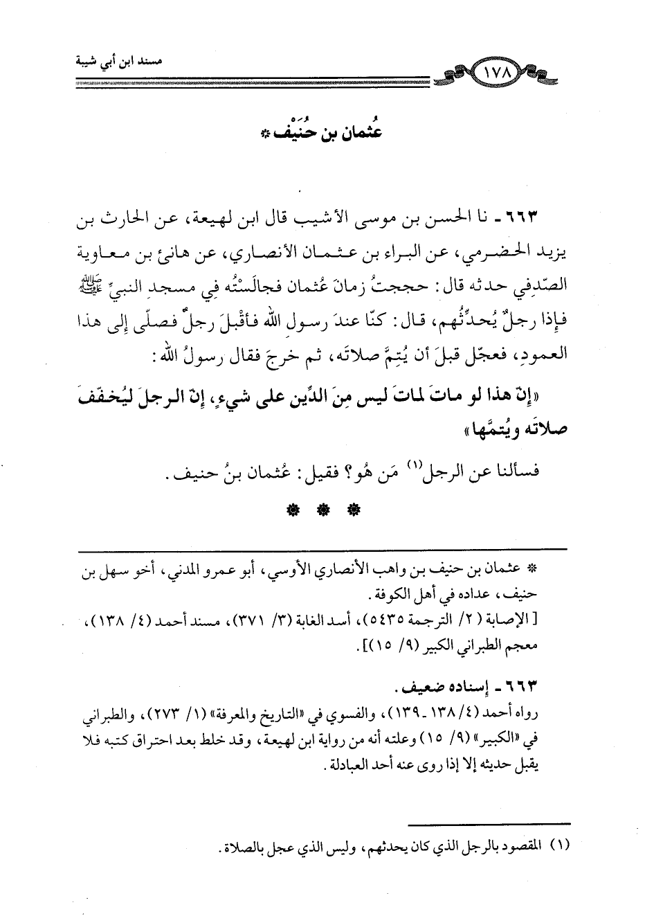 663 - نا الْحَسَنُ بْنُ مُوسَى الْأَشْيَبُ، قَالَ ابْنُ لَهِيعَةَ، عَنِ الْحَارِثِ بْنِ يَزِيدَ الْحَضْرَمِيِّ، عَنِ الْبَرَاءِ بْنِ عُثْمَانَ الْأَنْصَارِيِّ، عَنْ هَانِئِ بْنِ مُعَاوِيَةَ الصَّدَفِيِّ، حَدَّثَهُ قَالَ: حَجَجْتُ زَمَانَ عُثْمَانَ فَجَالَسْتُهُ فِي مَسْجِدِ النَّبِيِّ صَلَّى اللهُ عَلَيْهِ وَسَلَّمَ فَإِذَا رَجُلٌ يُحَدِّثُهُمْ، قَالَ: كُنَّا عِنْدَ رَسُولِ اللَّهِ فَأَقْبَلَ رَجُلٌ فَصَلَّى إِلَى هَذَا الْعَمُودِ، فَعَجِلَ قَبْلَ أَنْ يُتِمَّ صَلَاتَهُ، ثُمَّ خَرَجَ فَقَالَ رَسُولُ اللَّهِ: «إِنَّ §هَذَا لَوْ مَاتَ لَمَاتَ لَيْسَ مِنَ الدِّينِ عَلَى شَيْءٍ، إِنَّ الرَّجُلَ لَيُخَفِّفُ صَلَاتَهُ وَيُتِمُّهَا» فَسَأَلْنَا عَنِ الرَّجُلِ مَنْ هُوَ؟ فَقِيلَ: عُثْمَانُ بْنُ حُنَيْفٍ