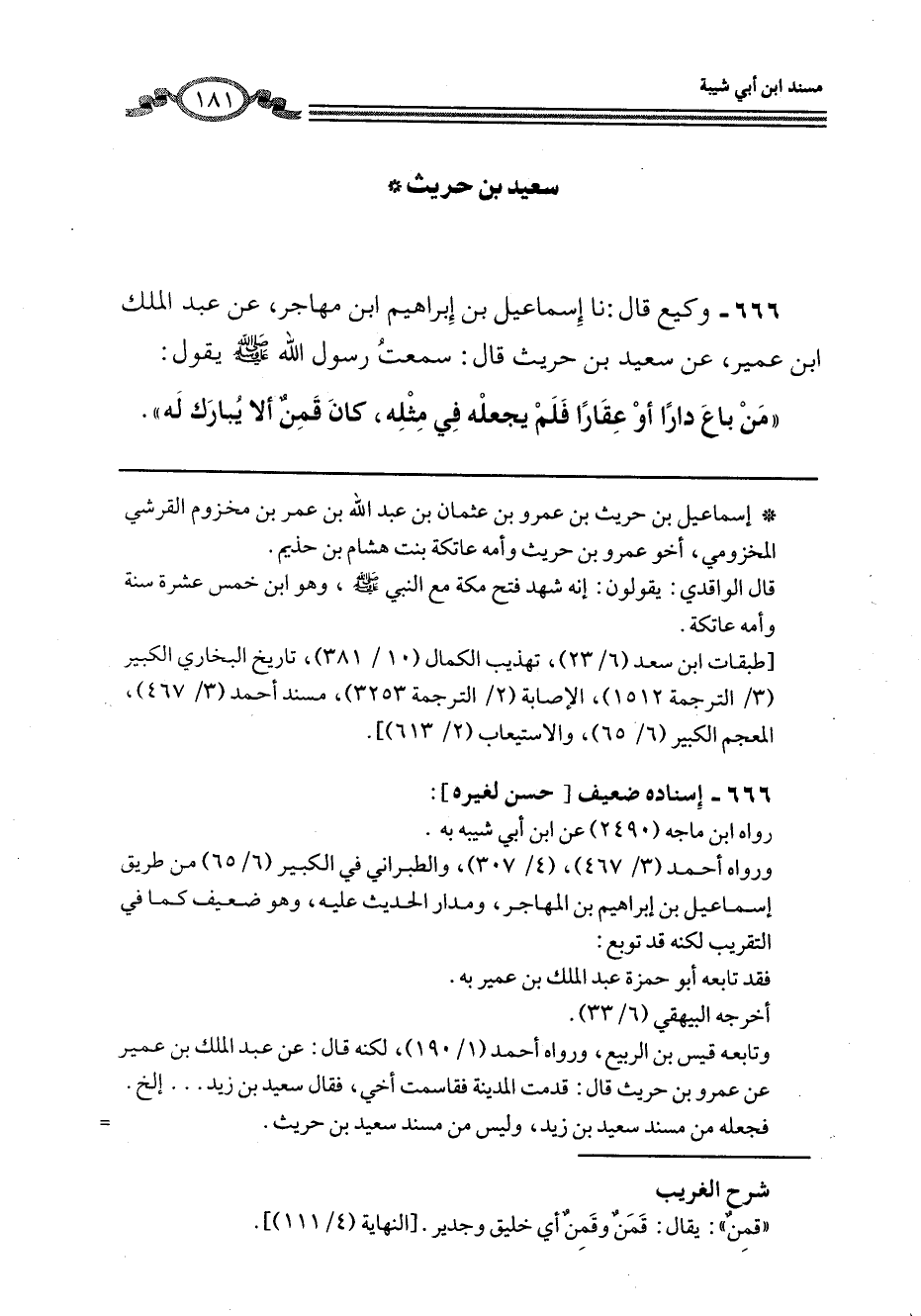 666 - وَكِيعٌ، قَالَ: نا إِسْمَاعِيلُ بْنُ إِبْرَاهِيمَ بْنِ مُهَاجِرٍ، عَنْ عَبْدِ الْمَلِكِ بْنِ عُمَيْرٍ، عَنْ سَعِيدِ بْنِ حُرَيْثٍ، قَالَ: سَمِعْتُ رَسُولَ اللَّهِ صَلَّى اللهُ عَلَيْهِ وَسَلَّمَ يَقُولُ: «§مَنْ بَاعَ دَارًا أَوْ عَقَارًا فَلَمْ يَجْعَلْهُ فِي مِثْلِهِ، كَانَ قَمِنٌ أَلَا يُبَارَكَ لَهُ» .