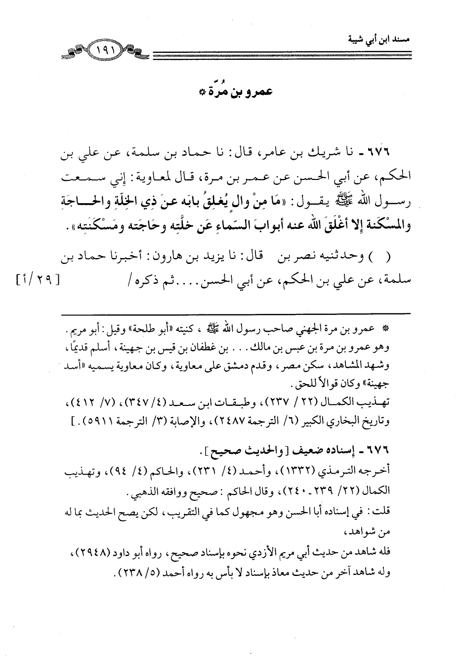 676 - نا شَرِيكُ بْنُ عَامِرٍ، قَالَ: نا حَمَّادُ بْنُ سَلَمَةَ، عَنْ عَلِيِّ بْنِ الْحَكَمِ، عَنْ أَبِي الْحَسَنِ عَنْ عُمَرَ بْنِ مُرَّةَ قَالَ لِمُعَاوِيَةَ: إِنِّي سَمِعْتُ رَسُولَ اللَّهِ صَلَّى اللهُ عَلَيْهِ وَسَلَّمَ يَقُولُ: «§مَا مِنْ وَالٍ يُغْلِقُ بَابَهُ عَنْ ذِي الْخَلَّةِ وَالْحَاجَةِ وَالْمسْكَنَةِ إِلَّا أَغْلَقَ اللَّهُ عَنْهُ أَبْوَابَ السَّمَاءِ عَنْ خَلَّتِهِ وَحَاجَتِهِ وَمَسْكَنَتِهِ» . وَحَدَّثَنِيهِ نَصْرُ بْنُ. . . .، قَالَ: نا يَزِيدُ بْنُ هَارُونَ، أَخْبَرَنَا حَمَّادُ بْنُ سَلَمَةَ، عَنْ عَلِيِّ بْنِ الْحَكَمِ، عَنْ أَبِي الْحَسَنِ ثُمَّ ذَكَرَهُ