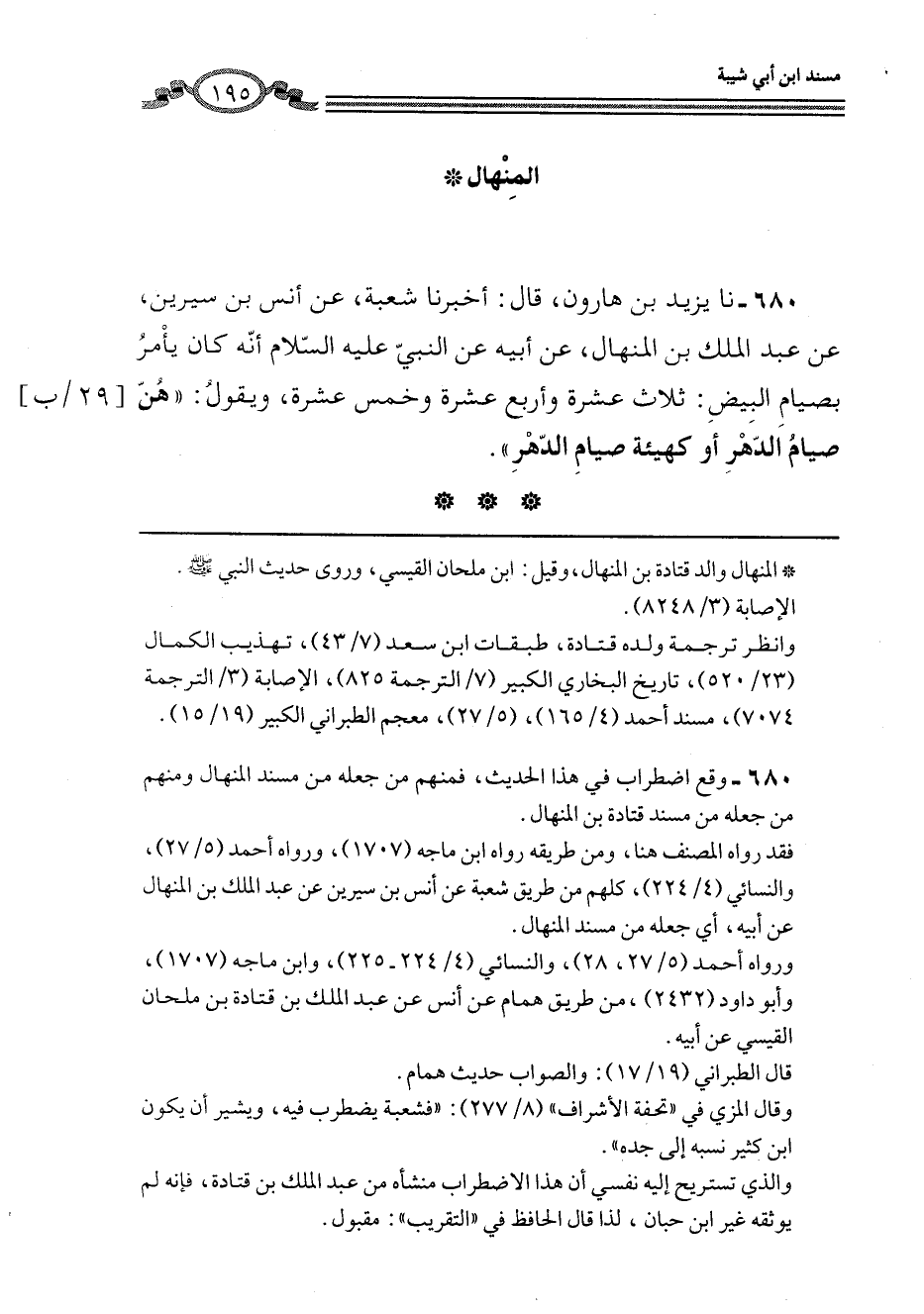 680 - نا يَزِيدُ بْنُ هَارُونَ، قَالَ: أَخْبَرَنَا شُعْبَةُ، عَنْ أَنَسِ بْنِ سِيرِينَ، عَنْ عَبْدِ الْمَلِكِ بْنِ الْمِنْهَالِ، عَنْ أَبِيهِ، عَنِ النَّبِيِّ عَلَيْهِ السَّلَامُ أَنَّهُ كَانَ §يَأْمُرُ بِصِيَامِ الْبِيضِ: ثَلَاثَ عَشْرَةَ، وَأَرْبَعَ عَشْرَةَ، وَخَمْسَ عَشْرَةَ، وَيَقُولُ: «هُنَّ صِيَامُ الدَّهْرِ - أَوْ كَهَيْئَةِ صِيَامِ الدَّهْرِ -»