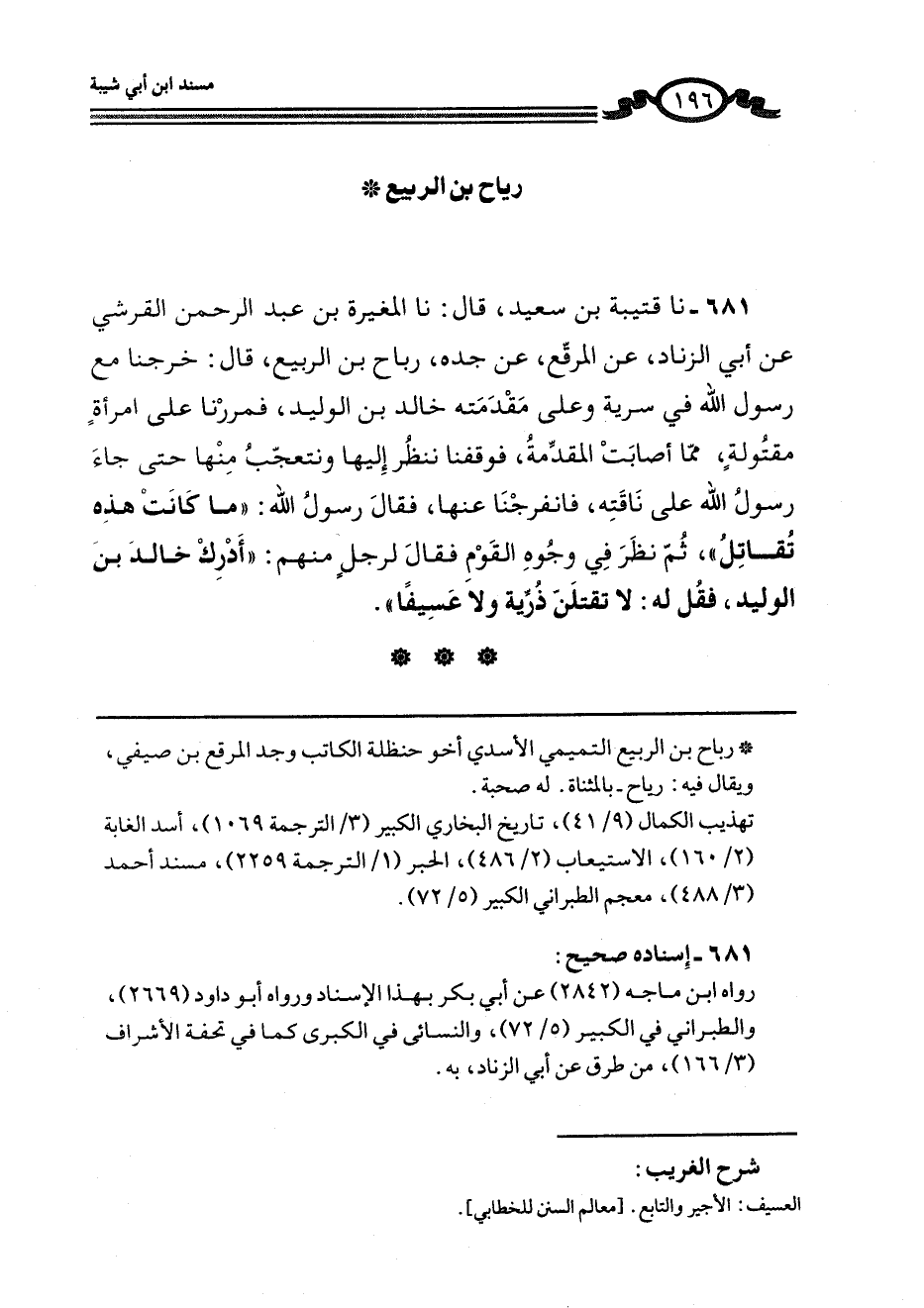 681 - نا قُتَيْبَةُ بْنُ سَعِيدٍ، قَالَ: نا الْمُغِيرَةُ بْنُ عَبْدِ الرَّحْمَنِ الْقُرَشِيُّ، عَنْ أَبِي الزِّنَادِ، عَنِ الْمُرَقَّعِ، عَنْ جَدِّهِ رَبَاحِ بْنِ الرَّبِيعِ، قَالَ: خَرَجْنَا مَعَ رَسُولِ اللَّهِ فِي سَرِيَّةٍ وَعَلَى مُقَدِّمَتِهِ خَالِدُ بْنُ الْوَلِيدِ فَمَرَرْنَا عَلَى امْرَأَةٍ مَقْتُولَةٍ، مِمَّا أَصَابَتِ الْمُقَدِّمَةُ، فَوَقَفْنَا نَنْظُرُ إِلَيْهَا وَنَتَعَجَّبُ مِنْهَا حَتَّى جَاءَ رَسُولُ اللَّهِ عَلَى نَاقَتِهِ، فَانْفَرَجْنَا عَنْهَا، فَقَالَ رَسُولُ اللَّهِ: «مَا كَانَتْ هَذِهِ تُقَاتِلُ» ، ثُمَّ نَظَرَ فِي وُجُوهِ الْقَوْمِ فَقَالَ لِرَجُلٍ مِنْهُمْ: " أَدْرِكْ خَالِدَ بْنَ الْوَلِيدِ: فَقُلْ لَهُ: §لَا تَقْتُلَنَّ ذُرِّيَّةً وَلَا عَسِيفًا "