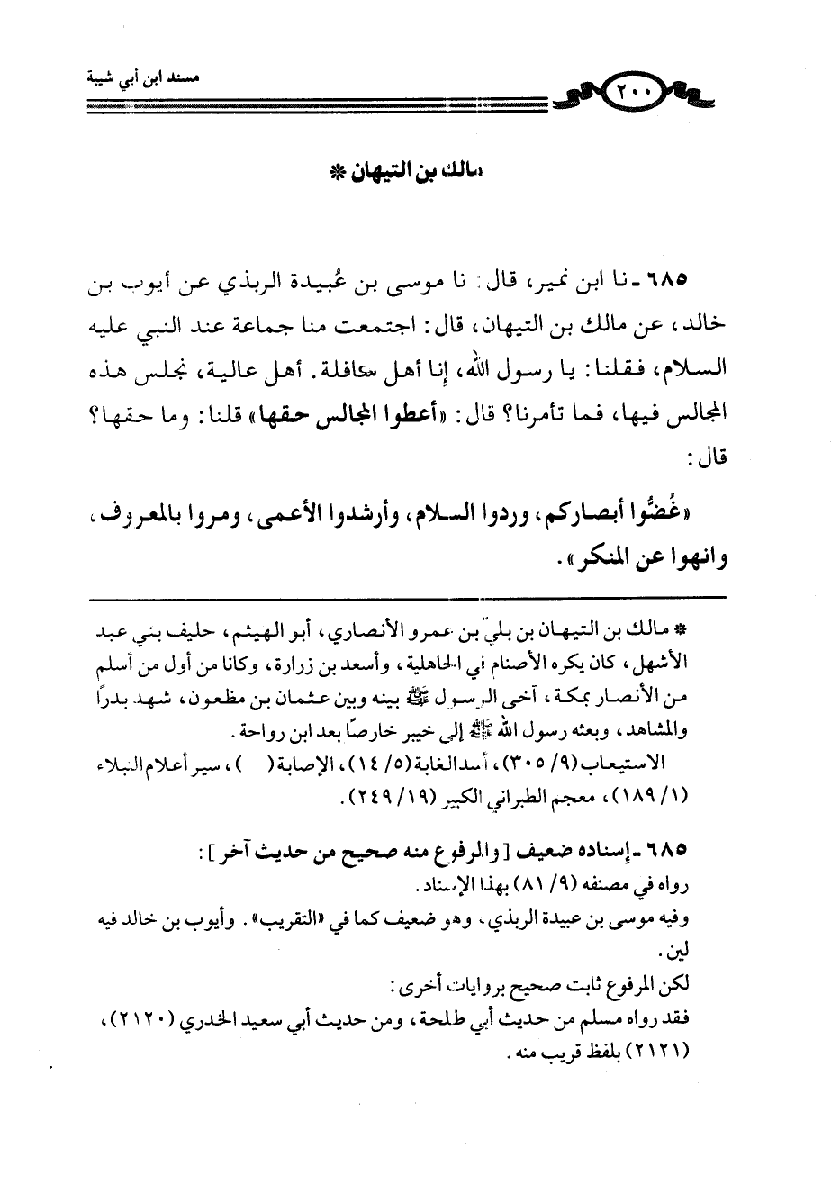 685 - نا ابْنُ نُمَيْرٍ، قَالَ: نا مُوسَى بْنُ عُبَيْدَةَ الرَّبَذِيُّ، عَنْ أَيُّوبَ بْنِ خَالِدٍ، عَنْ مَالِكِ بْنِ التَّيِّهَانِ، قَالَ: اجْتَمَعَتْ مِنَّا جَمَاعَةٌ عِنْدَ النَّبِيِّ عَلَيْهِ السَّلَامُ، فَقُلْنَا: يَا رَسُولَ اللَّهِ إِنَّا أَهْلُ سَافِلَةٍ، أَهْلُ عَالِيَةٍ، نَجْلِسُ هَذِهِ الْمَجَالِسَ فِيهَا فَمَا تَأْمُرُنَا؟ قَالَ: «أَعْطُوا الْمَجَالِسَ حَقَّهَا» قُلْنَا: وَمَا حَقُّهَا؟ قَالَ: «§غُضُّوا أَبْصَارَكُمْ، وَرُدُّوا السَّلَامَ، وَأَرْشِدُوا الْأَعْمَى، وَمُرُوا بِالْمَعْرُوفِ، وَانْهَوْا عَنِ الْمُنْكَرِ»