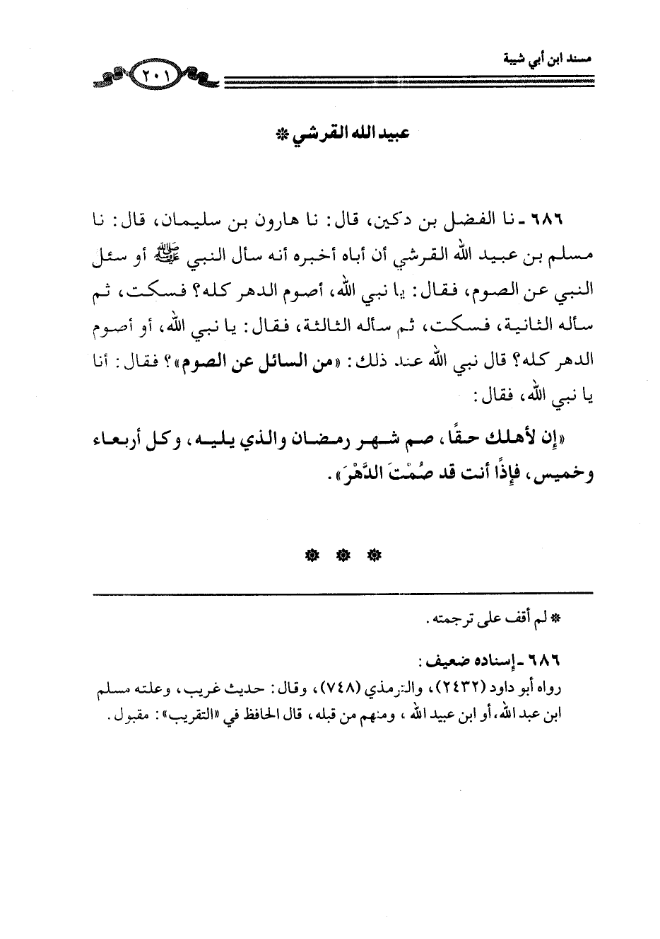 686 - نا الْفَضْلُ بْنُ دُكَيْنٍ، قَالَ: نا هَارُونُ بْنُ سُلَيْمَانَ، قَالَ: نا مُسْلِمُ بْنُ عُبَيْدِ اللَّهِ الْقُرَشِيُّ، أَنَّ أَبَاهُ، أَخْبَرَهُ أَنَّهُ سَأَلَ النَّبِيَّ صَلَّى اللهُ عَلَيْهِ وَسَلَّمَ - أَوْ سُئِلَ النَّبِيُّ - عَنِ الصَّوْمِ، فَقَالَ: يَا نَبِيَّ اللَّهِ أَصُومُ الدَّهْرَ كُلَّهُ؟ فَسَكَتَ، ثُمَّ سَأَلَهُ الثَّانِيَةَ، فَسَكَتَ، ثُمَّ سَأَلَهُ الثَّالِثَةَ، فَقَالَ: يَا نَبِيَّ اللَّهِ أَوَ أَصُومُ الدَّهْرَ كُلَّهُ؟ قَالَ نَبِيُّ اللَّهِ عِنْدَ ذَلِكَ: «مَنِ السَّائِلُ عَنِ الصَّوْمِ؟» فَقَالَ: أَنَا يَا نَبِيَّ اللَّهِ، فَقَالَ: «§إِنَّ لِأَهْلِكَ حَقًّا، صُمْ شَهْرَ رَمَضَانَ وَالَّذِي يَلِيهِ، وَكُلَّ أَرْبِعَاءَ وَخَمِيسٍ، فَإِذَا أَنْتَ قَدْ صُمْتَ الدَّهْرَ»