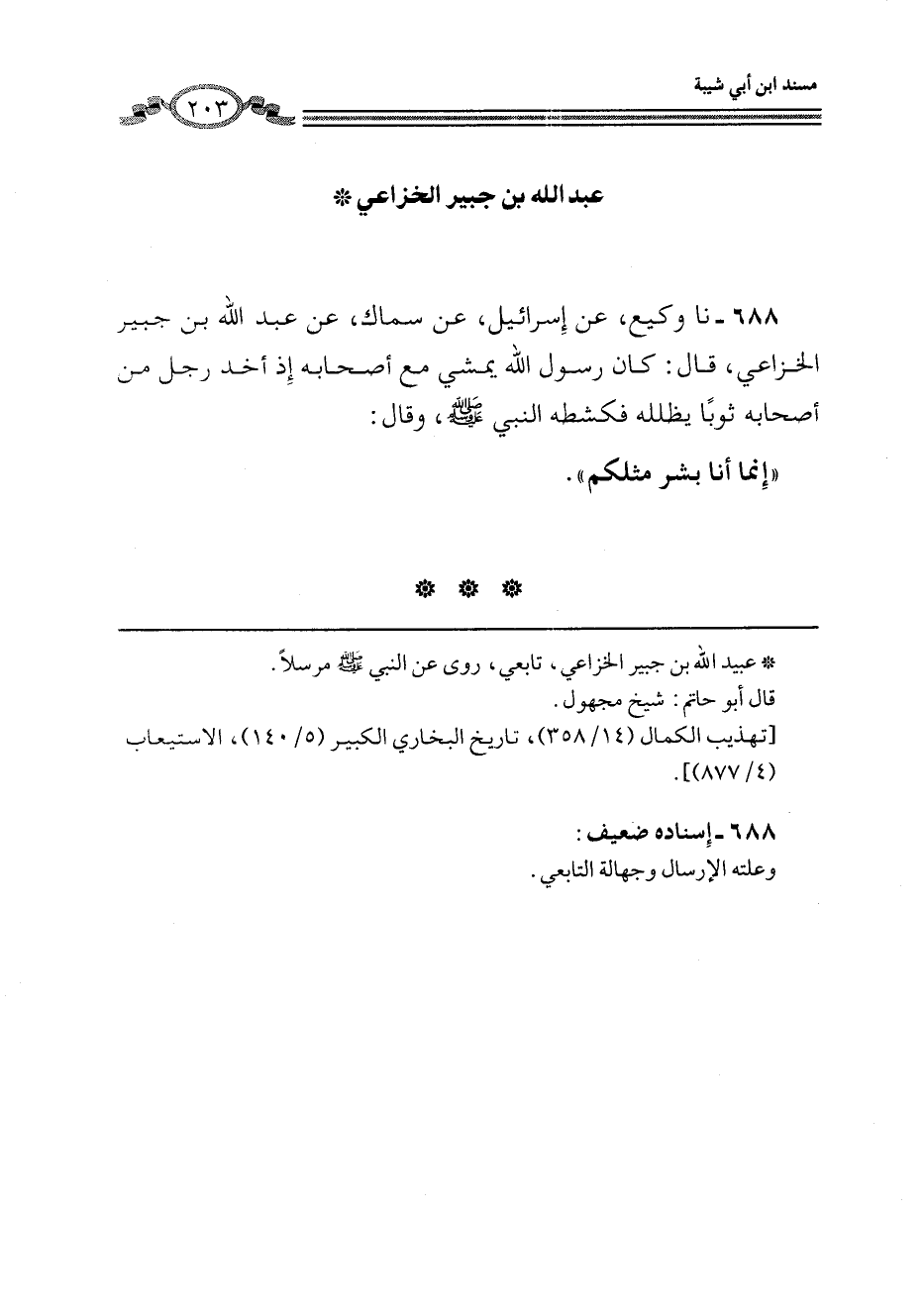688 - نا وَكِيعٌ، عَنْ إِسْرَائِيلَ، عَنْ سِمَاكٍ، عَنْ عَبْدِ اللَّهِ بْنِ جُبَيْرٍ الْخُزَاعِيِّ، قَالَ: كَانَ رَسُولُ اللَّهِ يَمْشِي مَعَ أَصْحَابِهِ إِذْ أَخَذَ رَجُلٌ مِنْ أَصْحَابِهِ ثَوْبًا يُظَلِّلُهُ فَكَشَطَهُ النَّبِيُّ صَلَّى اللهُ عَلَيْهِ وَسَلَّمَ، وَقَالَ: «§إِنَّمَا أَنَا بَشَرٌ مِثْلُكُمْ»